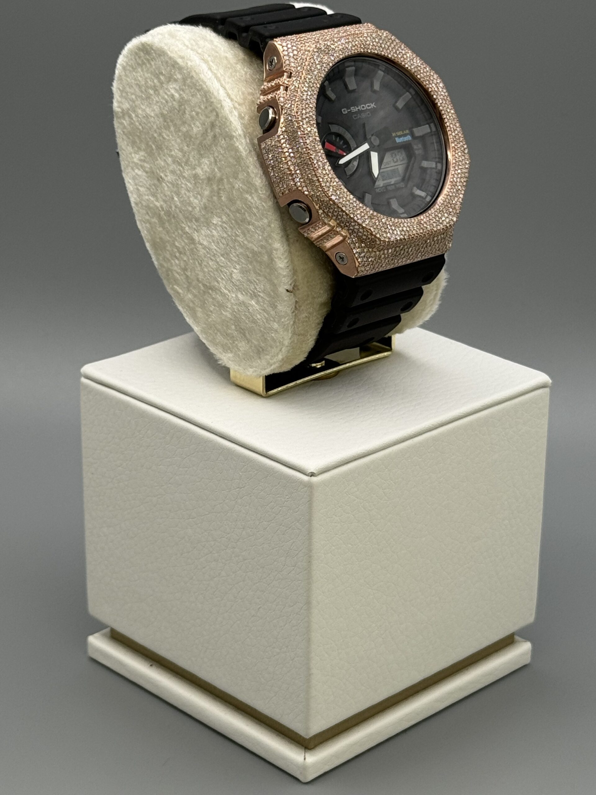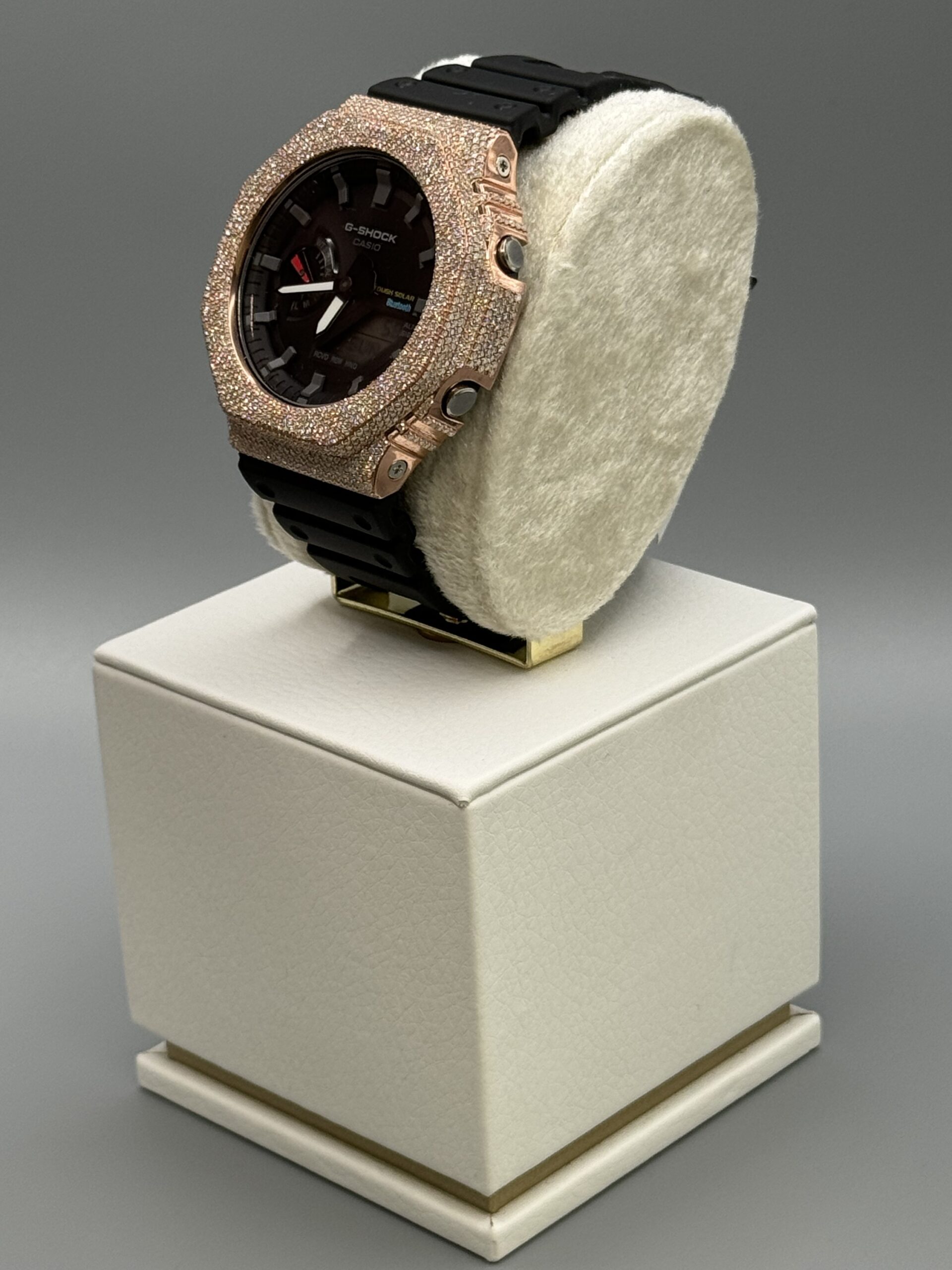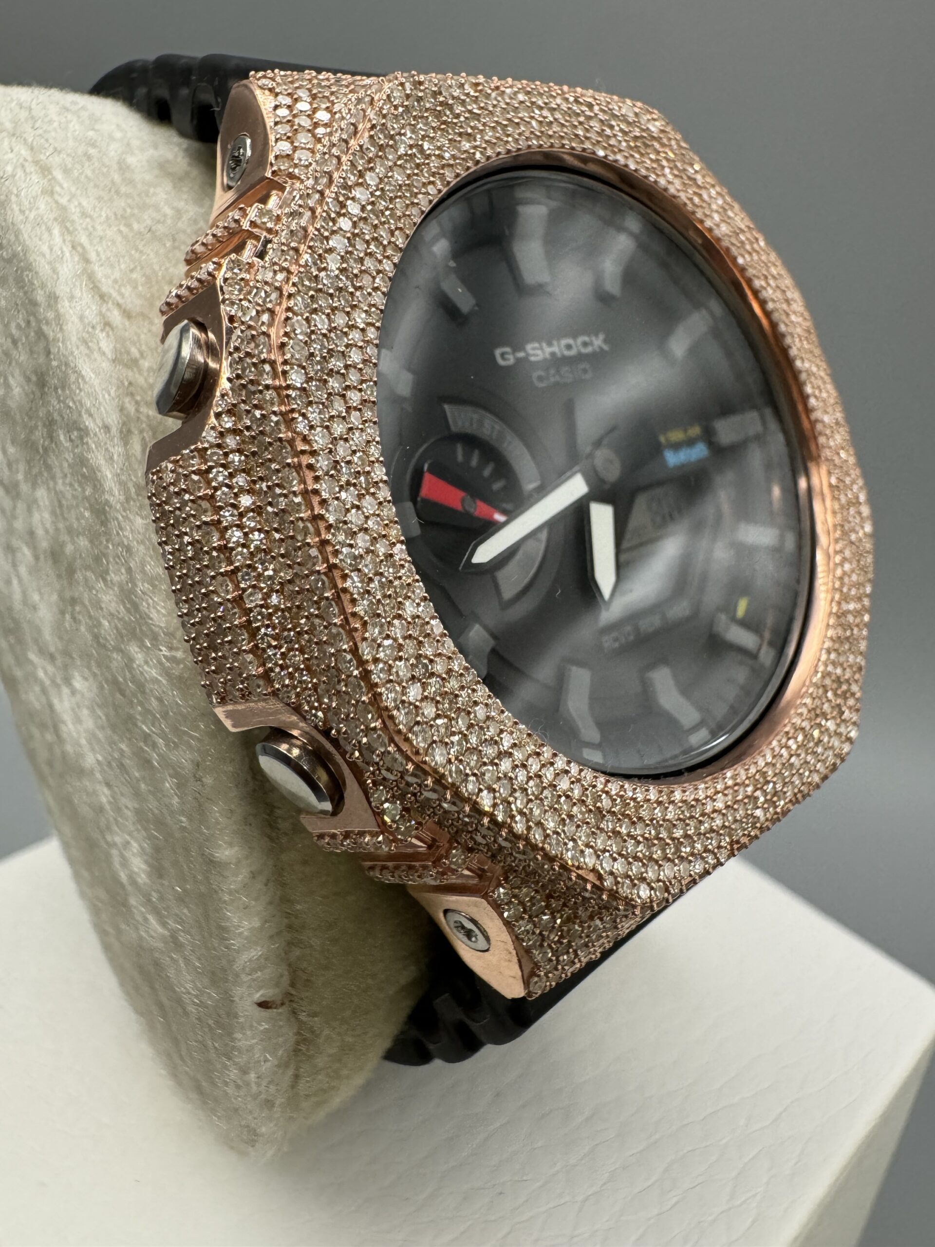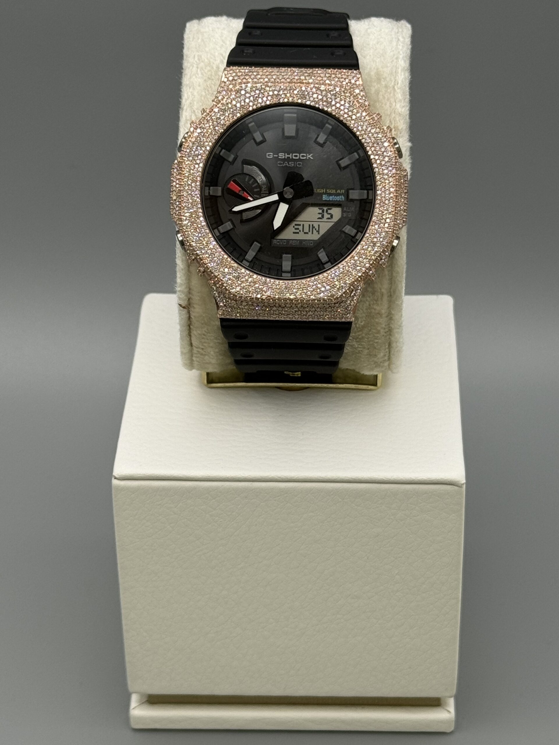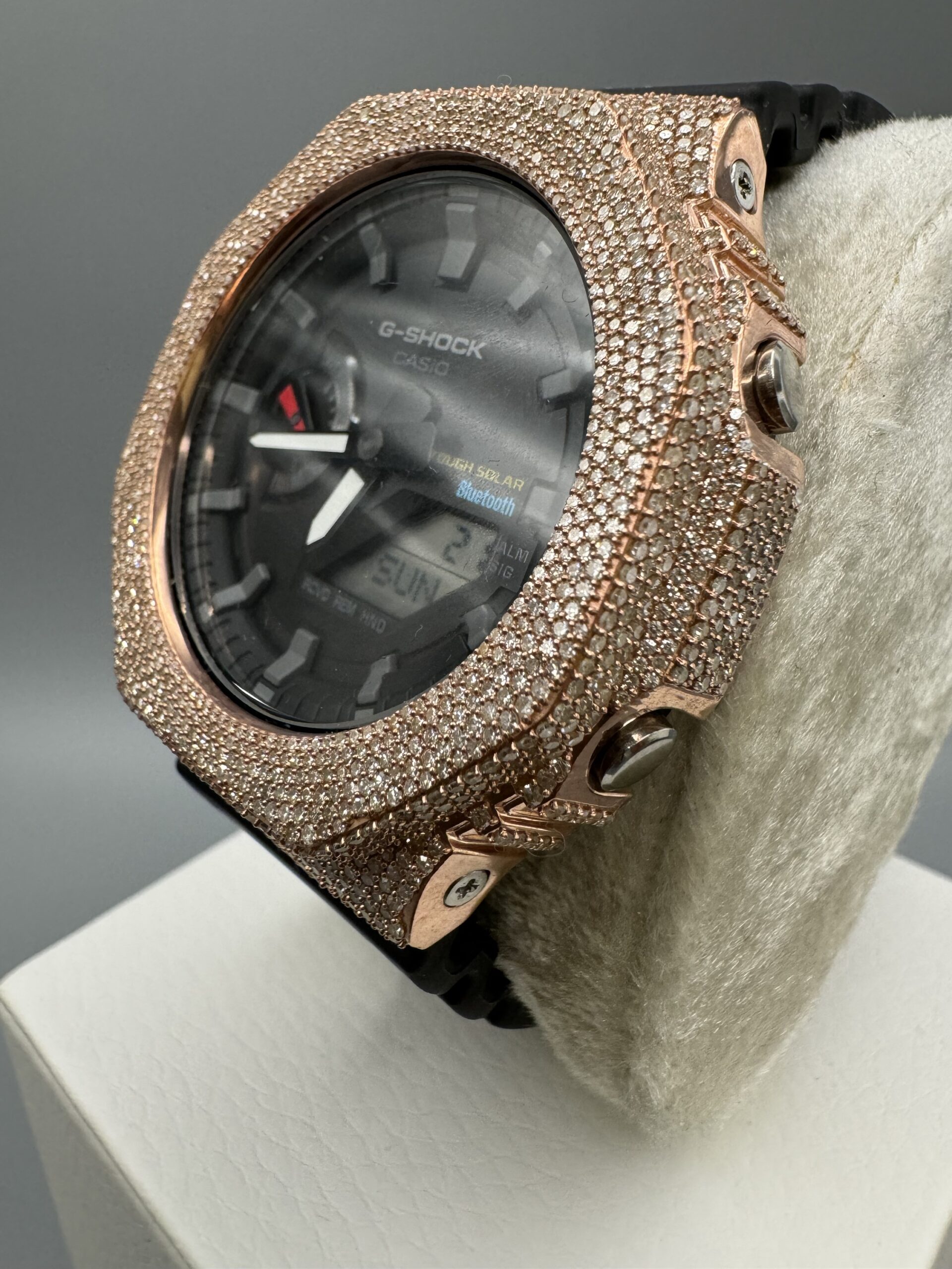 Custom 5.00CT Diamond G-Shock Watch Rose Gold Plated Casing With Honeycomb Set Natural Diamonds 41MM Bluetooth + Solar No Battery Needed NeePowered GA2100 Model