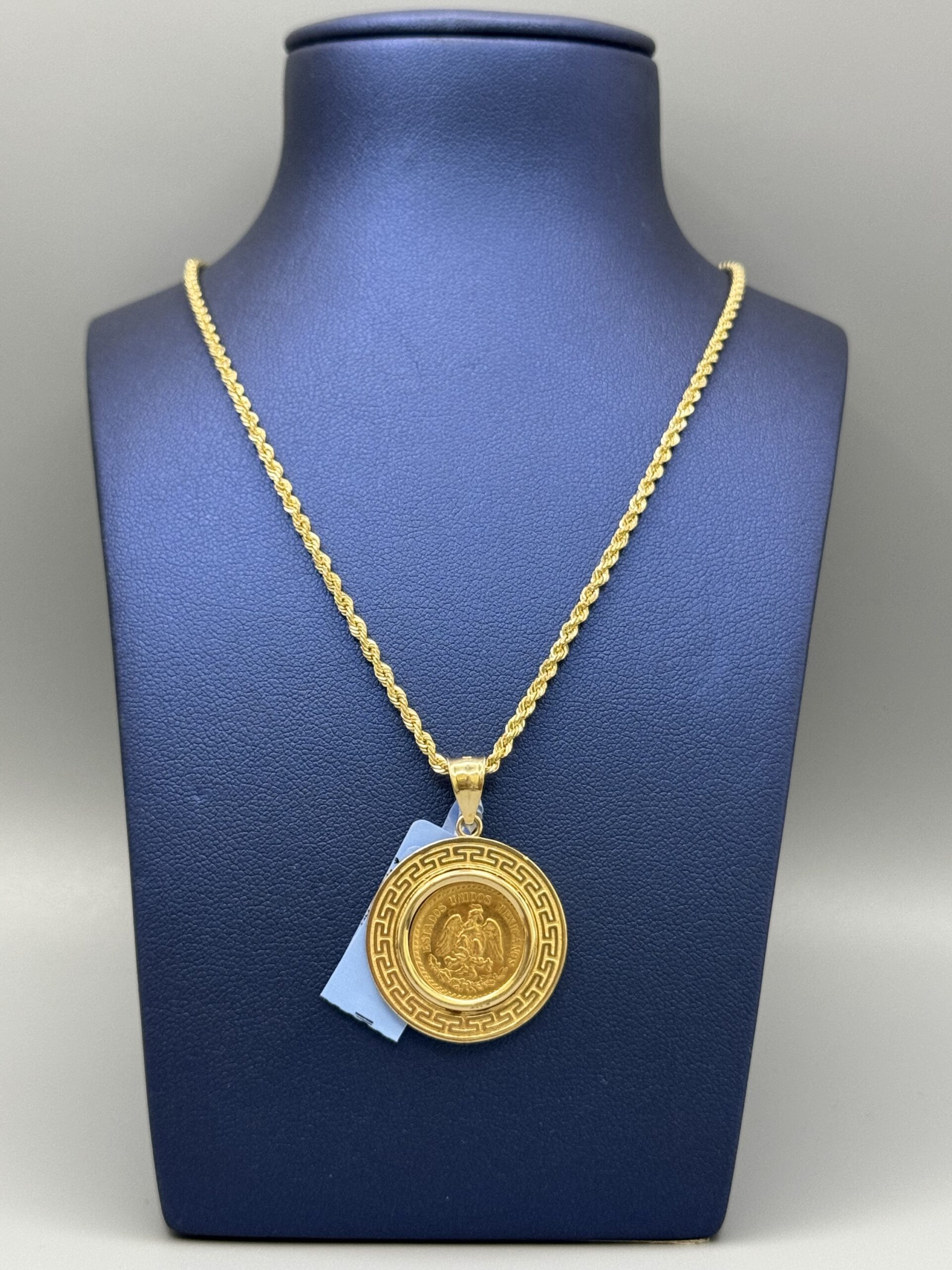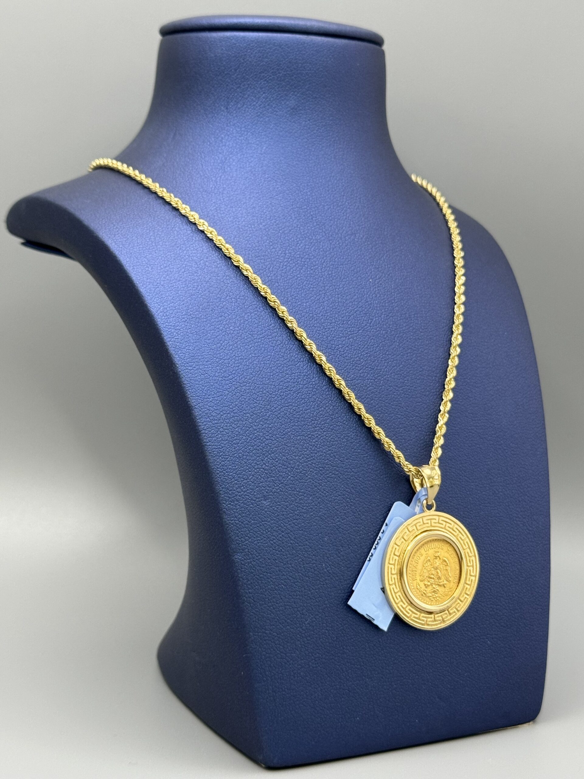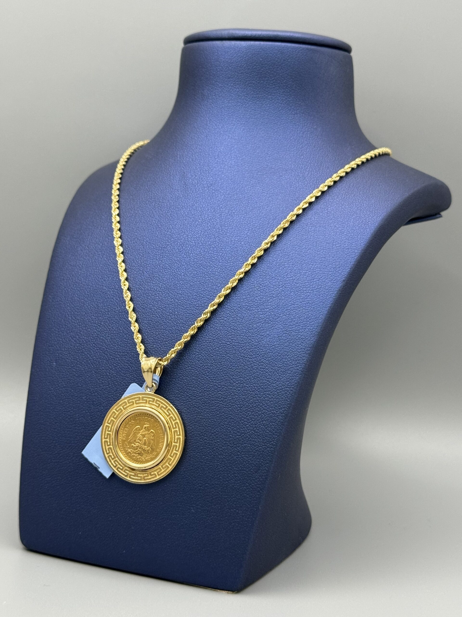 22KT Centenario 2.5 Pesos Coin ComboSet Sets In 14Kt Gold Bezel With 14KT Gold Rope Necklace 2MM 22″ Approx Golf Weight Of Necklace 8.1 Gram Pendant 1″ All Around By 1.5″ Tall Approx Gold Weight Of The Pendant Includes Bezel 5.8 Gram