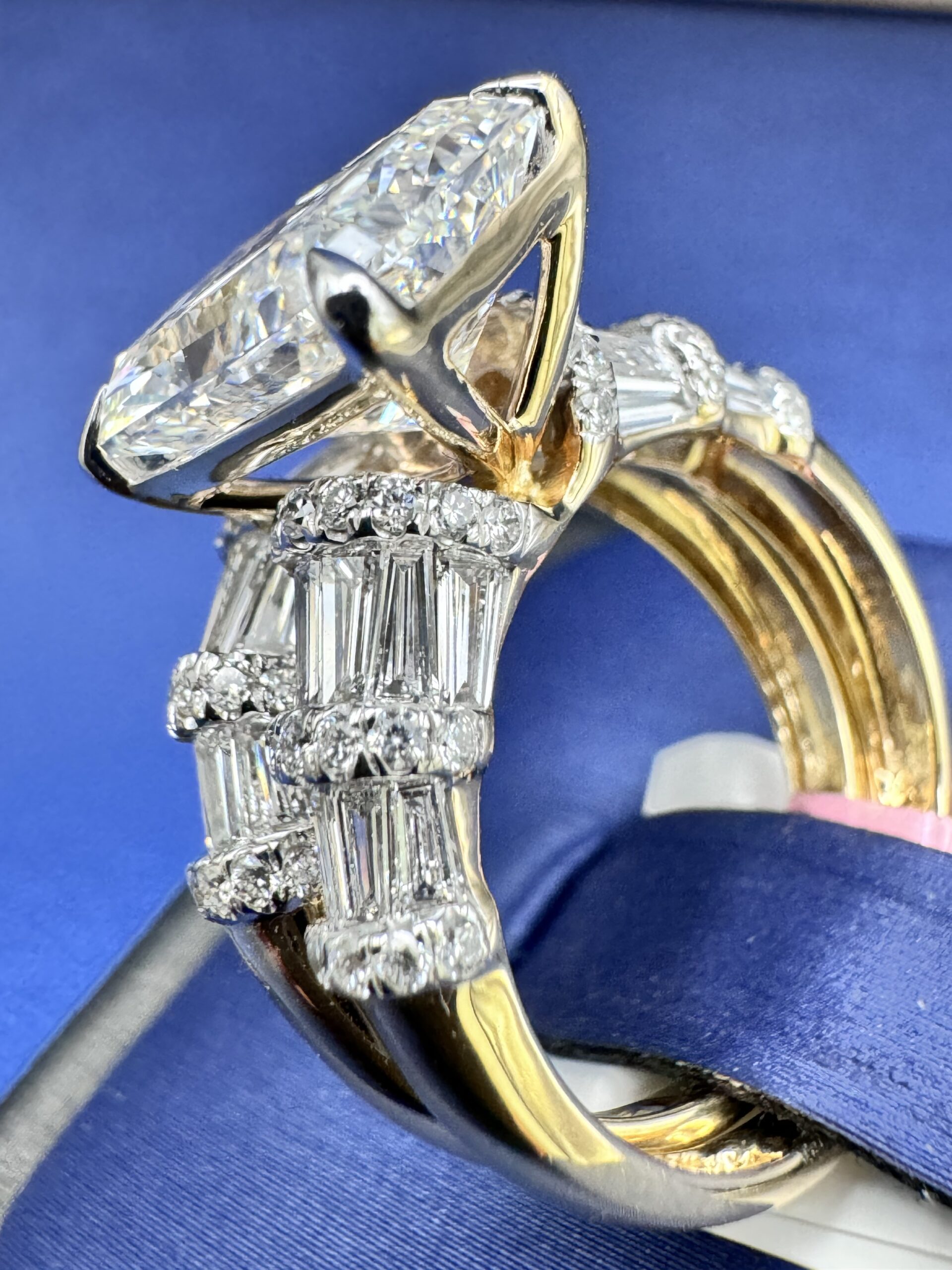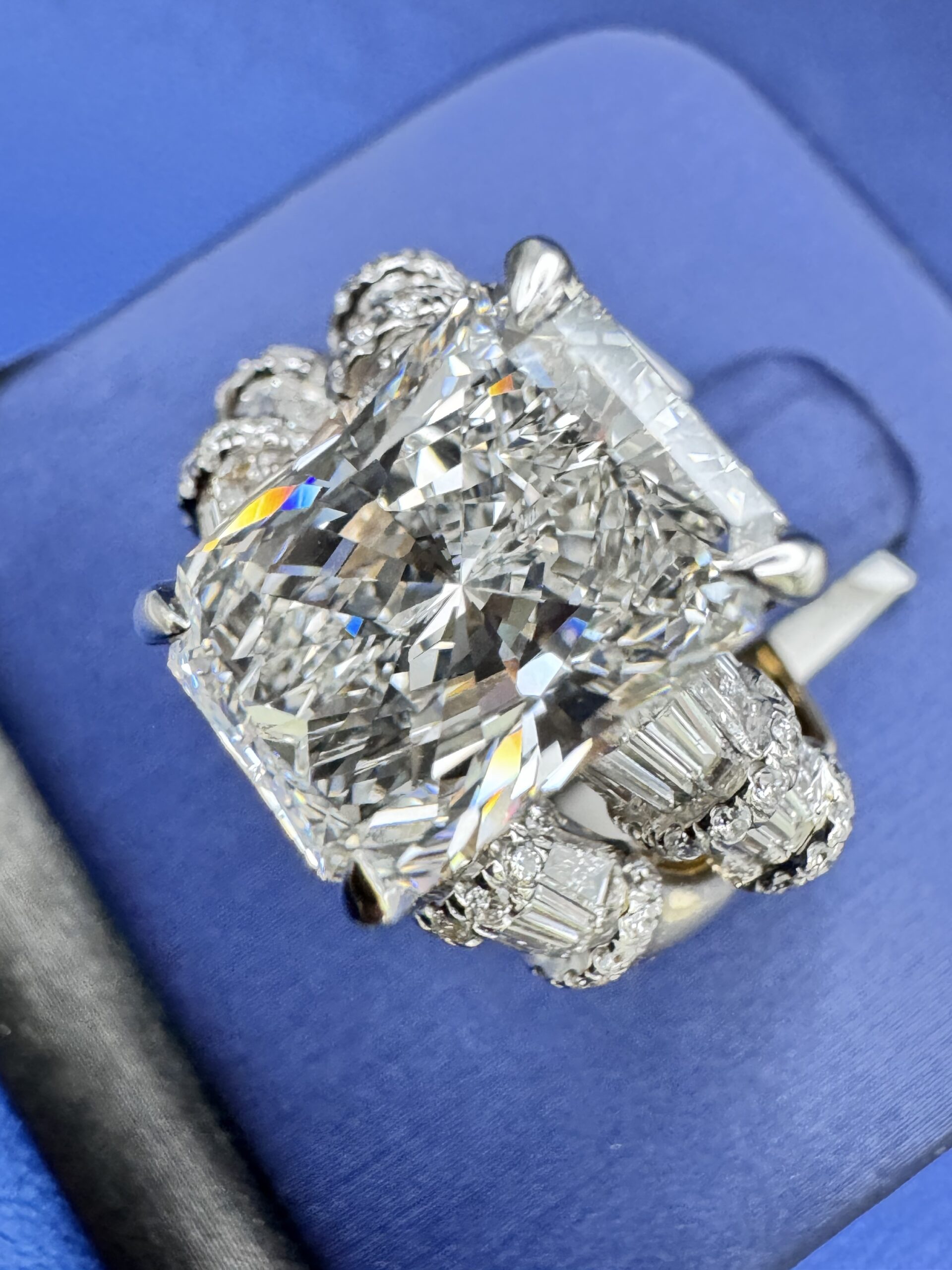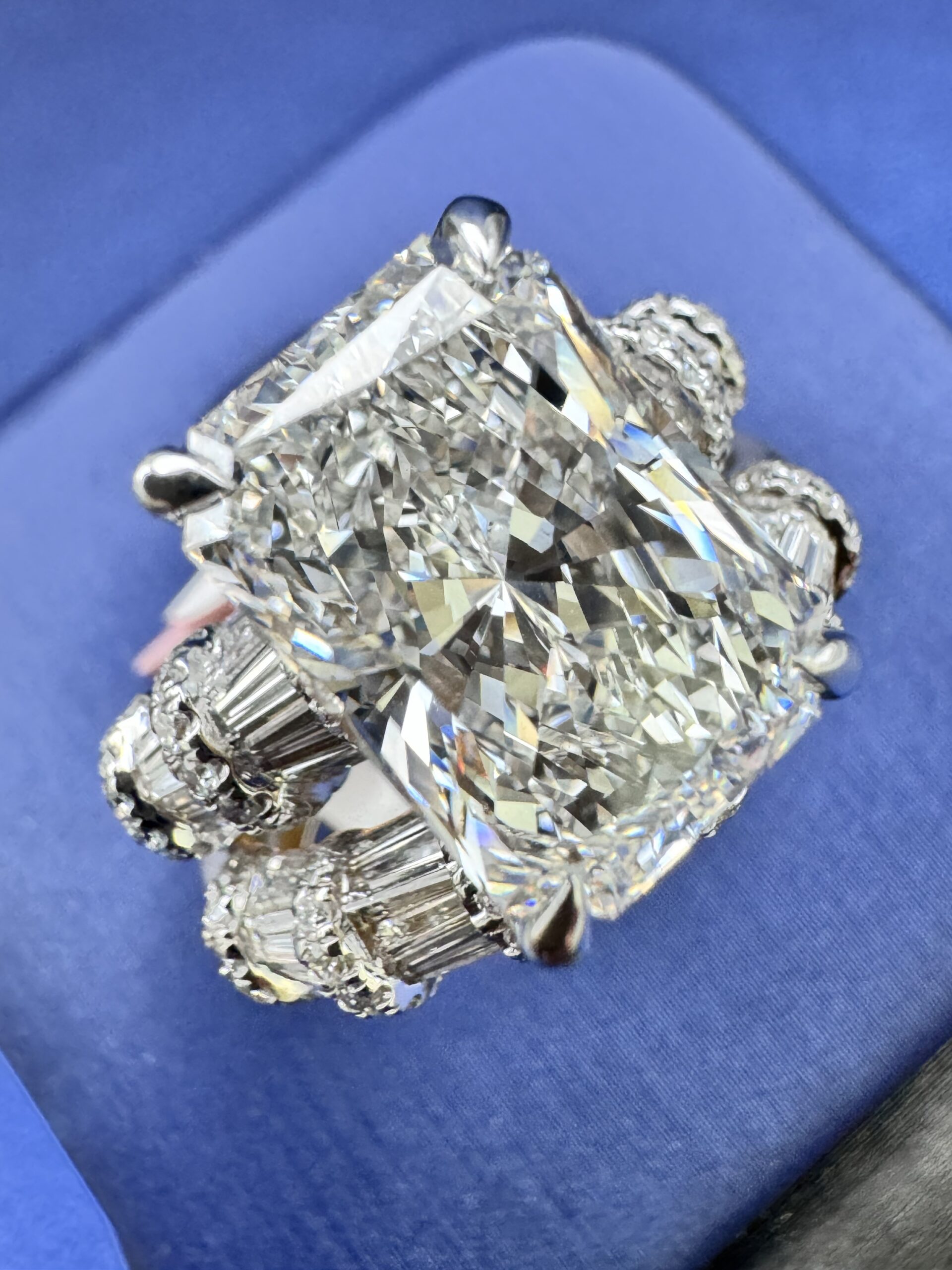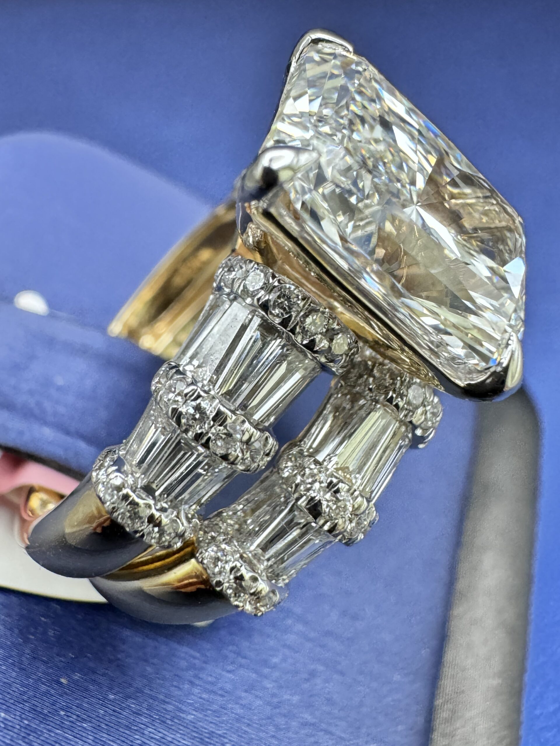 14KT Gold 7.17CT LabGrown RadiantCut Diamond Bridal With Baguettes and RoundCut Band And Sides 5.06CT Center Solitaire VVS F Color Size 7 Approx Gold Weight 7.6 Gram