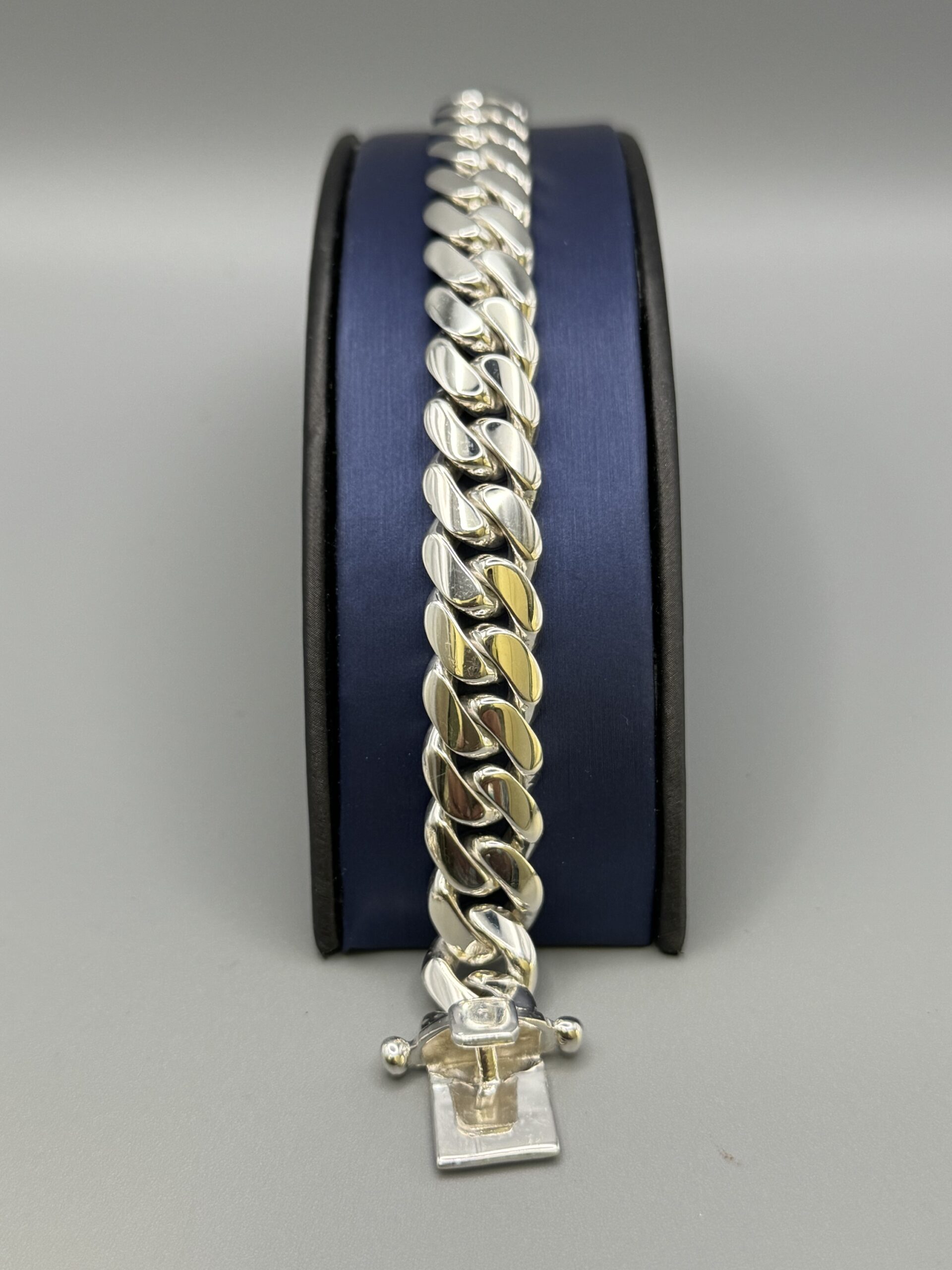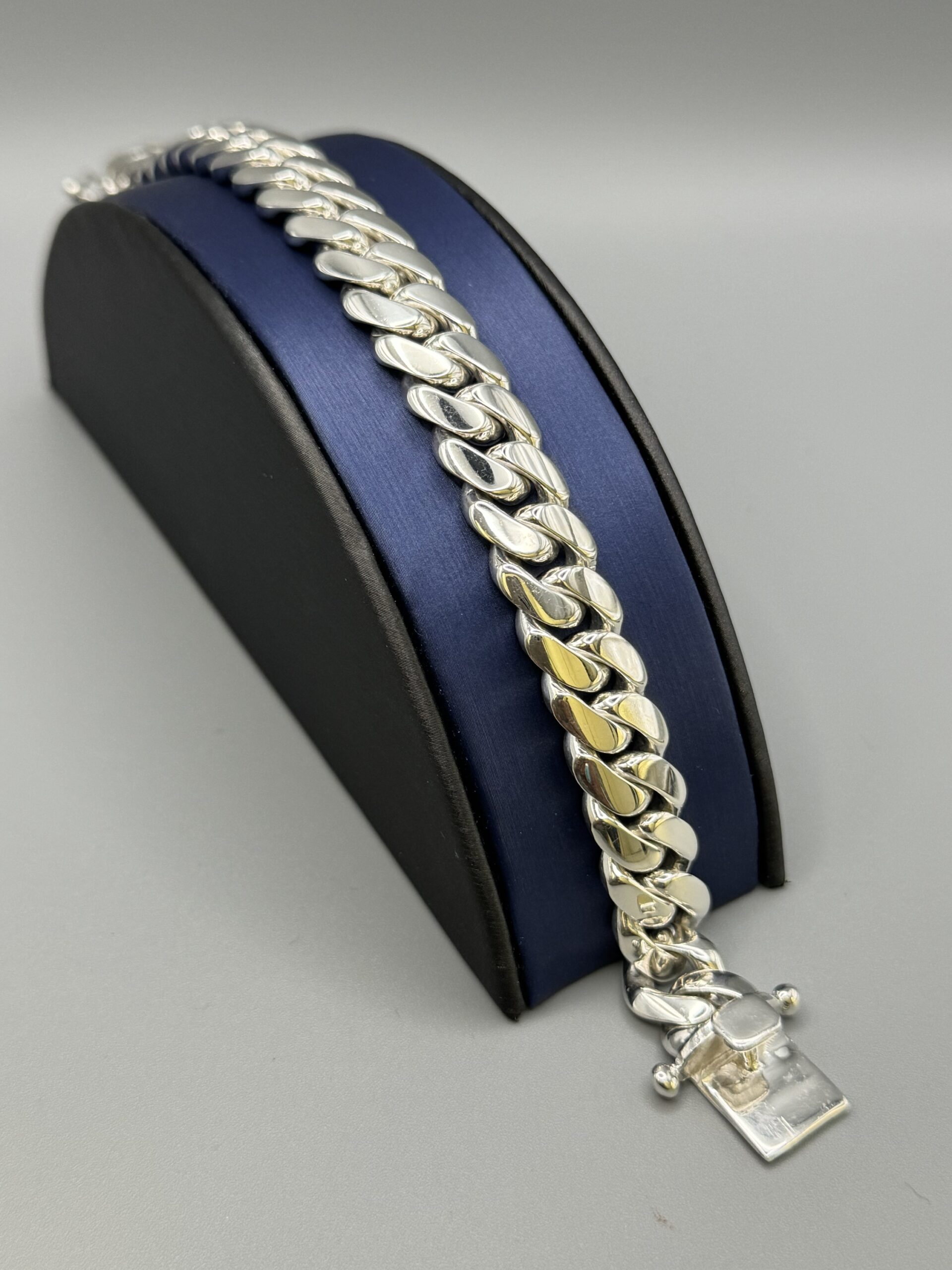 Elevate your style with our Pure Silver 13MM Handmade Miami Cuban Bracelet. At 8 inches and approx. 85.6 grams, it’s a shiny statement piece perfect for any occasion—wear it and shine!