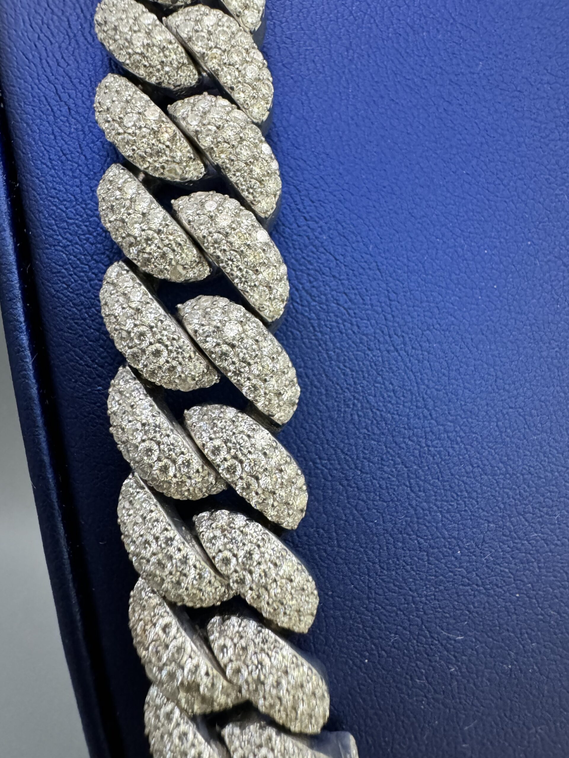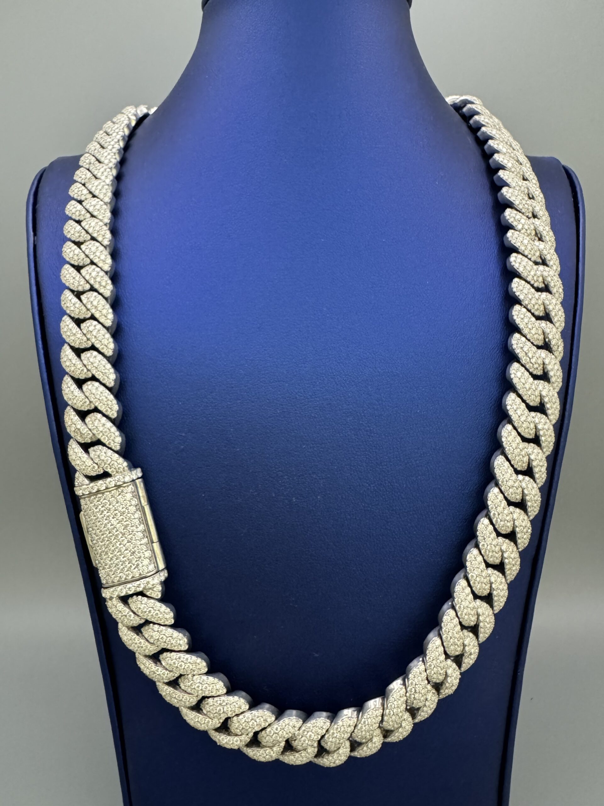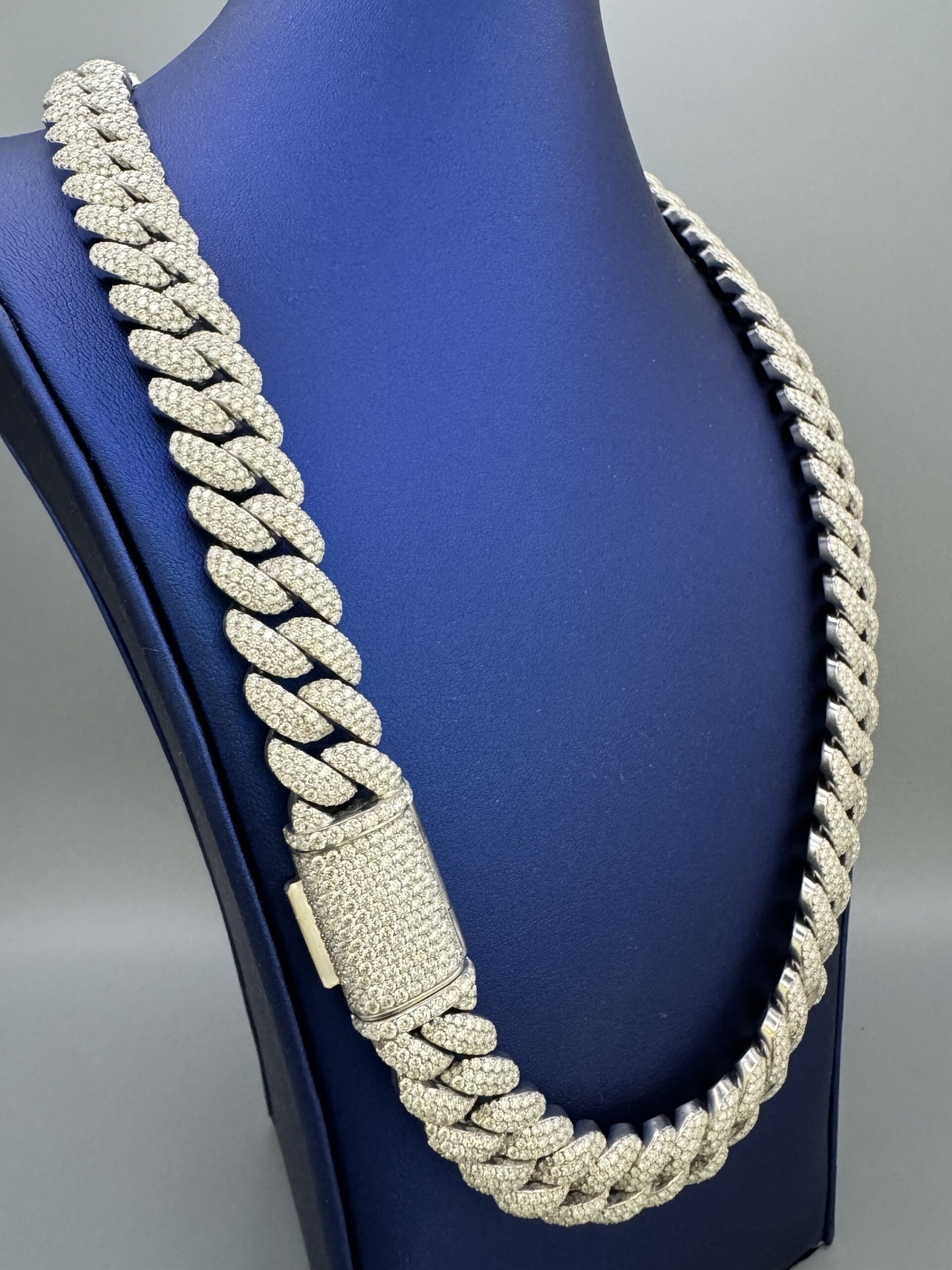 Elevate your style with this stunning 22″ Cuban necklace featuring 50.00CT of VVS clarity Moissanite set in elegantly crafted rhodium white gold. A perfect blend of luxury and sophistication.