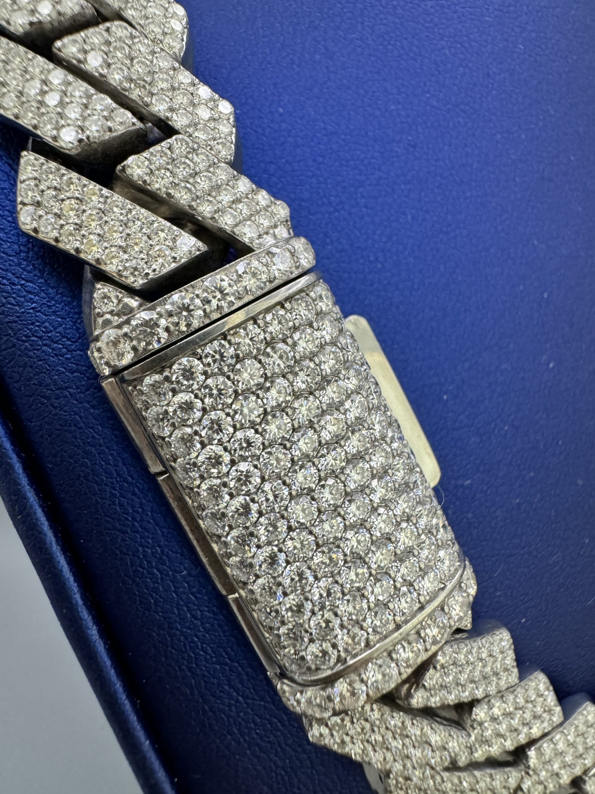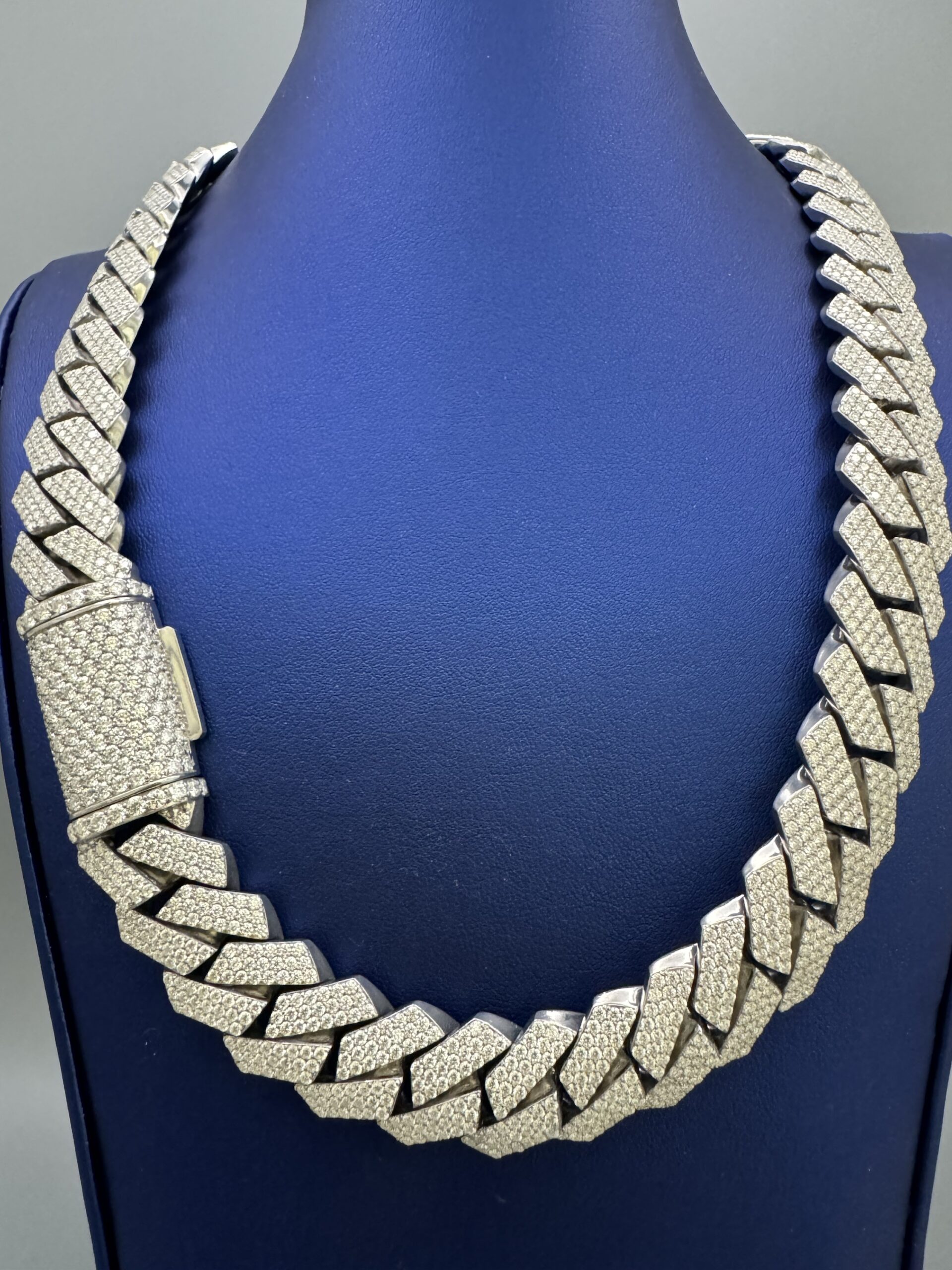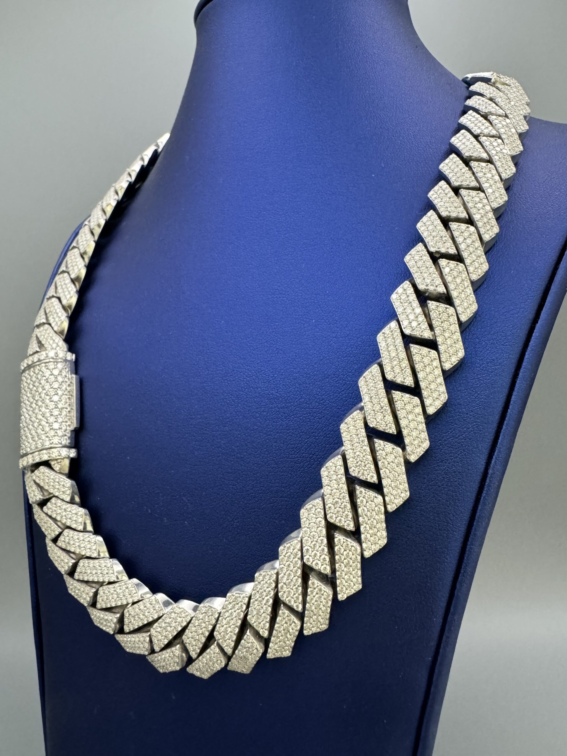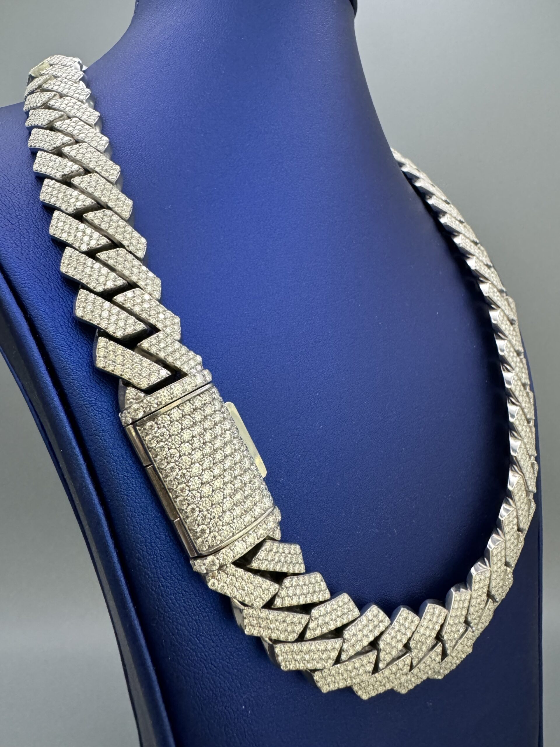 Sterling Silver 17MM 50.00CT Moissanite Cuban Necklace 20″ Approx Weight 271.0 Gram Rhodium White Gold Finish VVs Clarity D Color