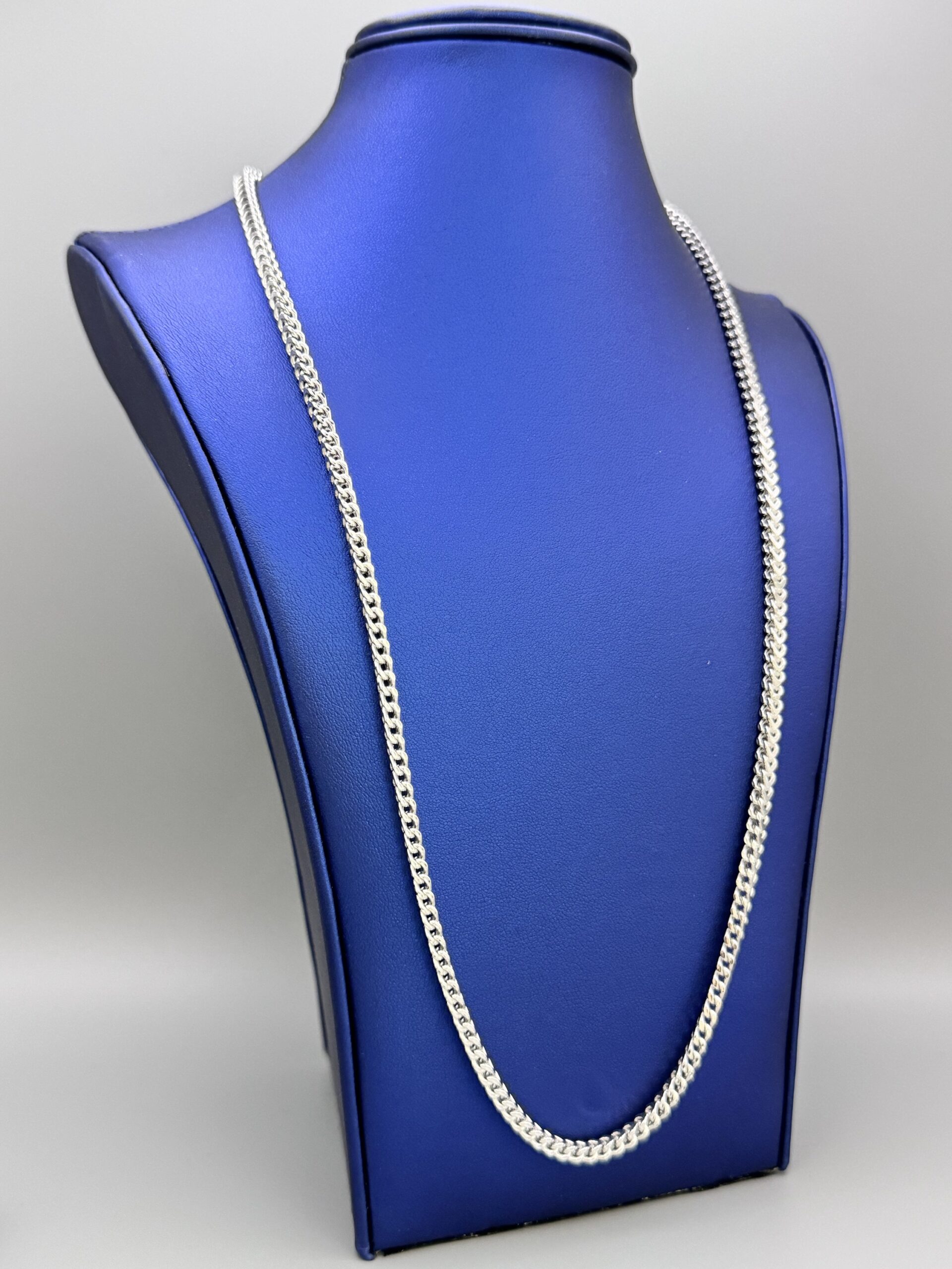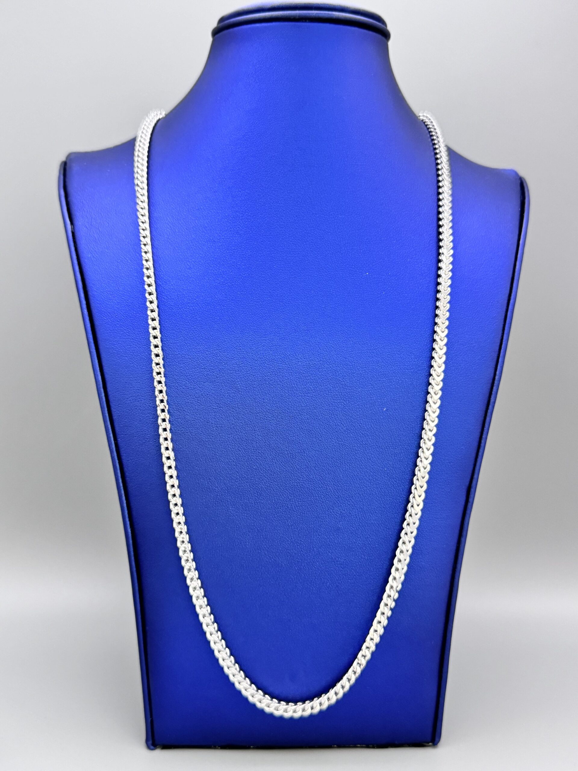 Elevate your style with our exclusive 24” Italian Franco Necklace. Crafted from 3MM sterling silver with a rhodium white gold finish, it’s anti-tarnish and weighs approx. 18.4 grams for lasting shine.
