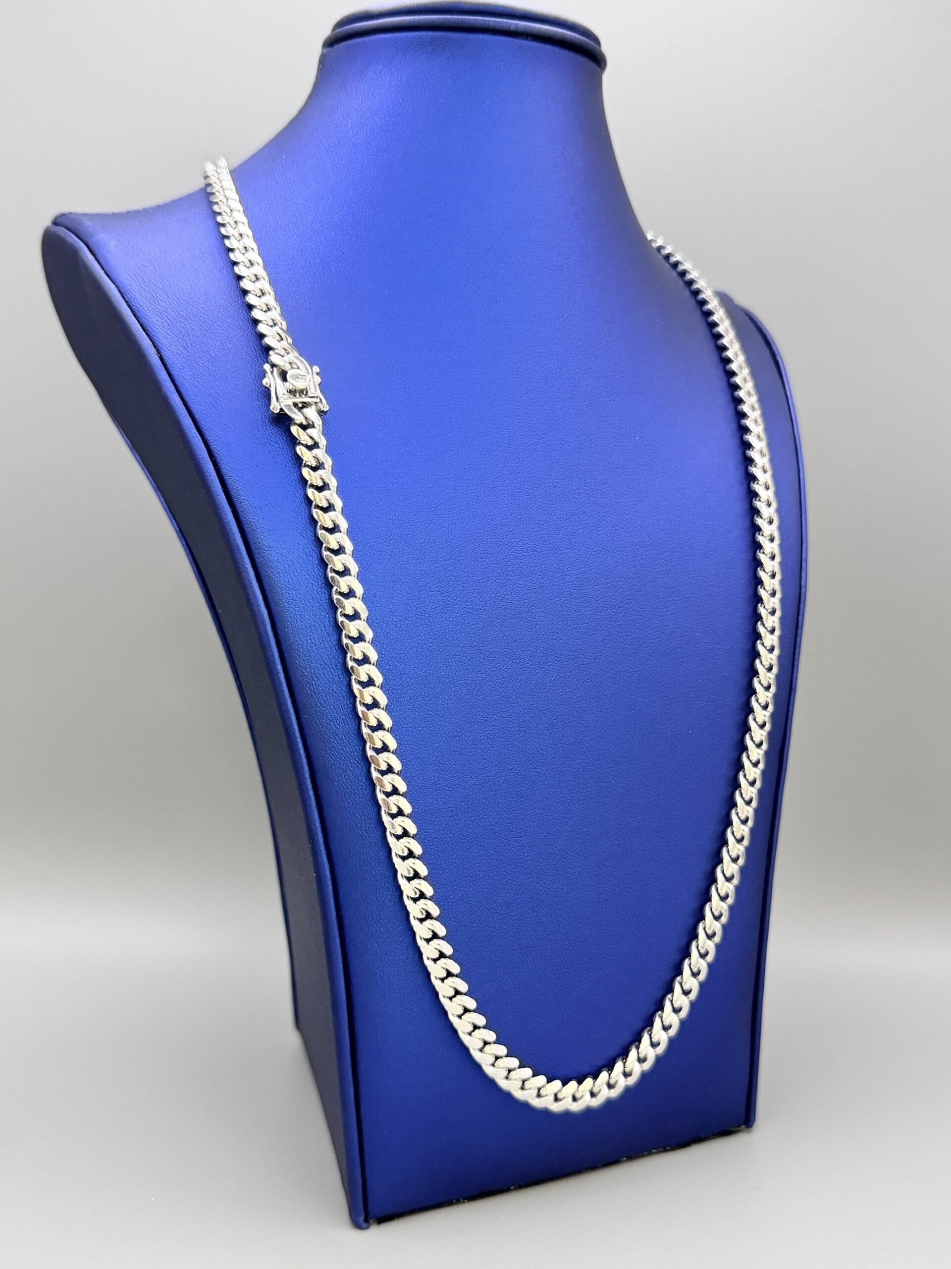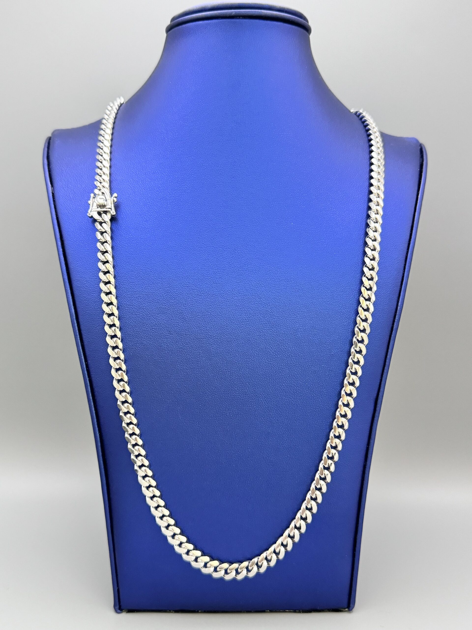 Elevate your style with this exclusive 22″ Miami Cuban Necklace crafted from sterling silver with a rhodium white gold finish. Lightweight at 52 grams, it resists tarnish and features a secure box lock.