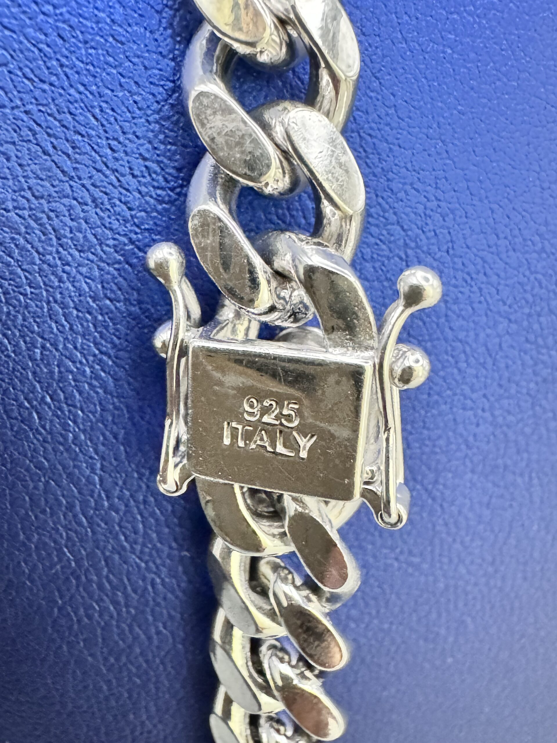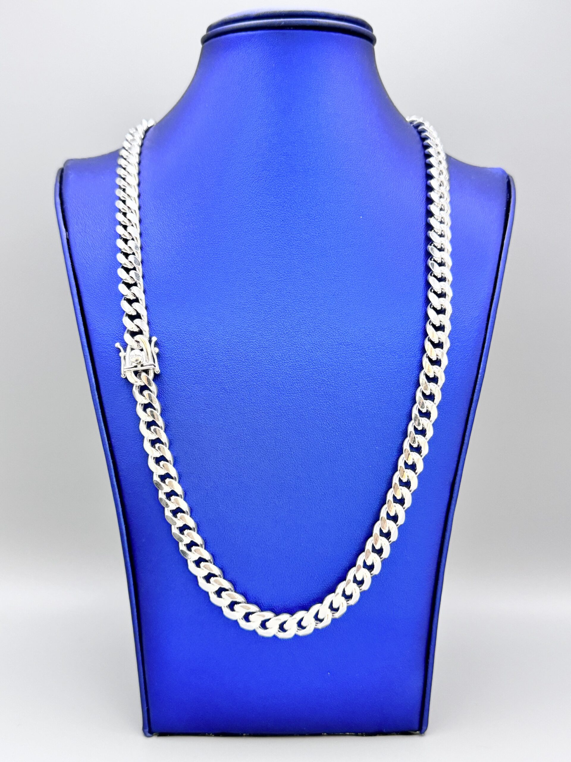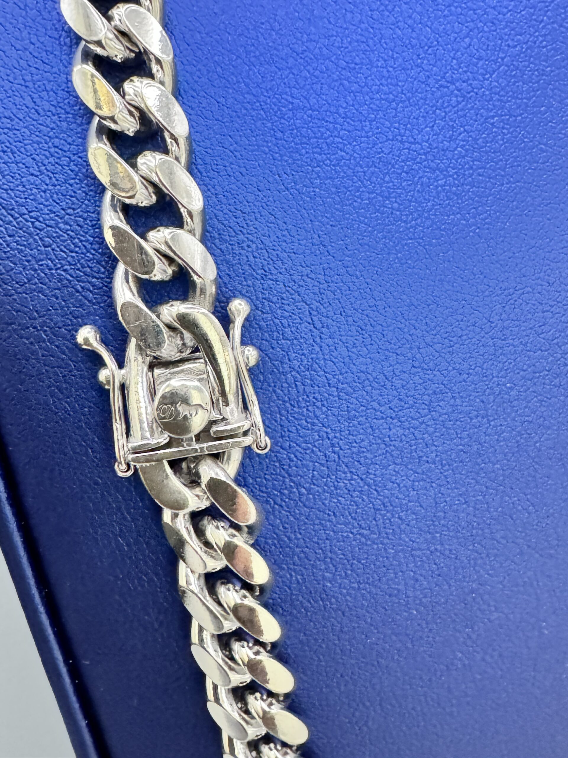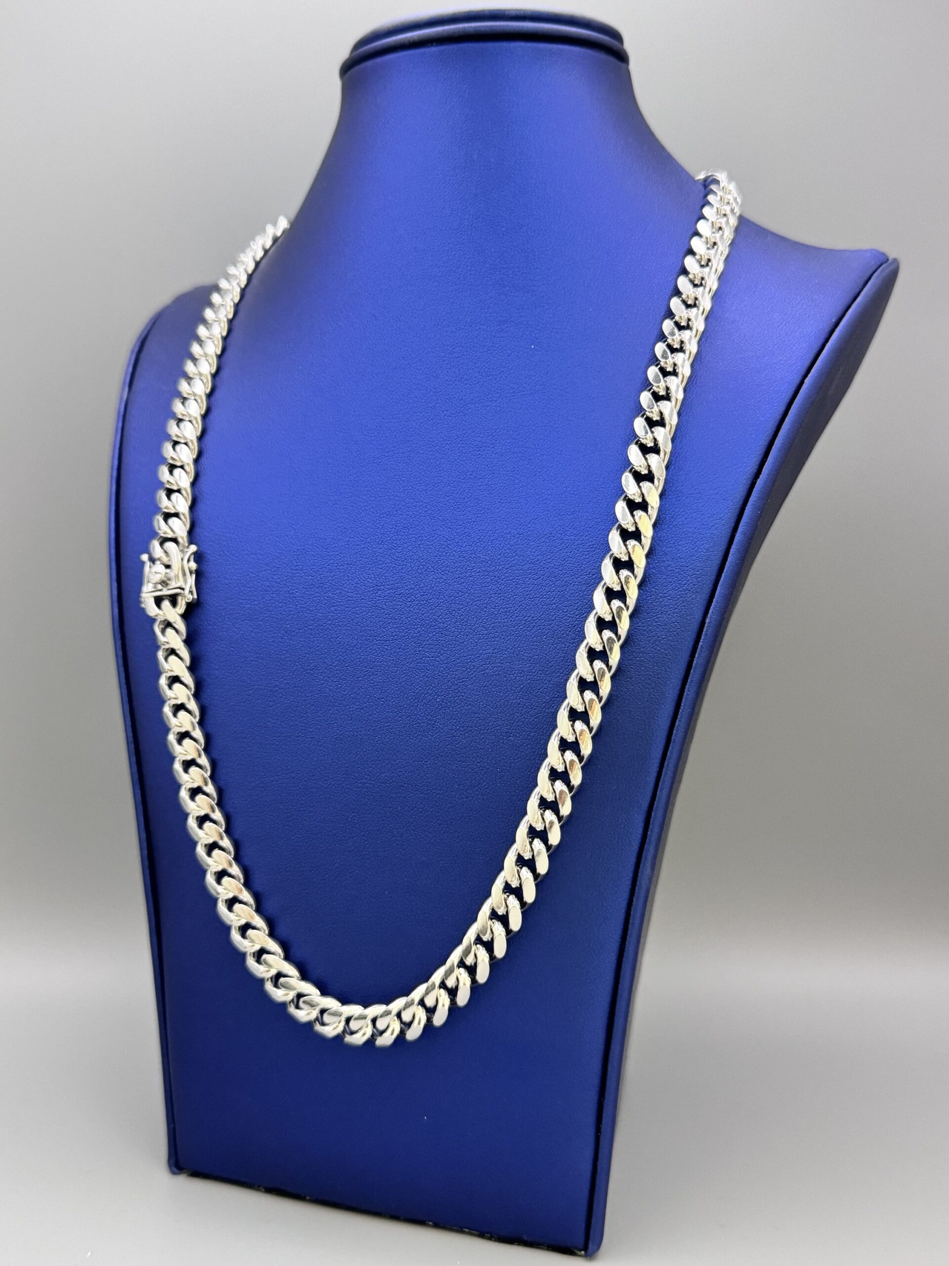 Elevate your style with this 8MM Miami Cuban necklace, crafted from sterling silver with a rhodium white gold finish. Anti-tarnish properties and a secure box lock ensure lasting elegance. Approx. 93.7 grams.
