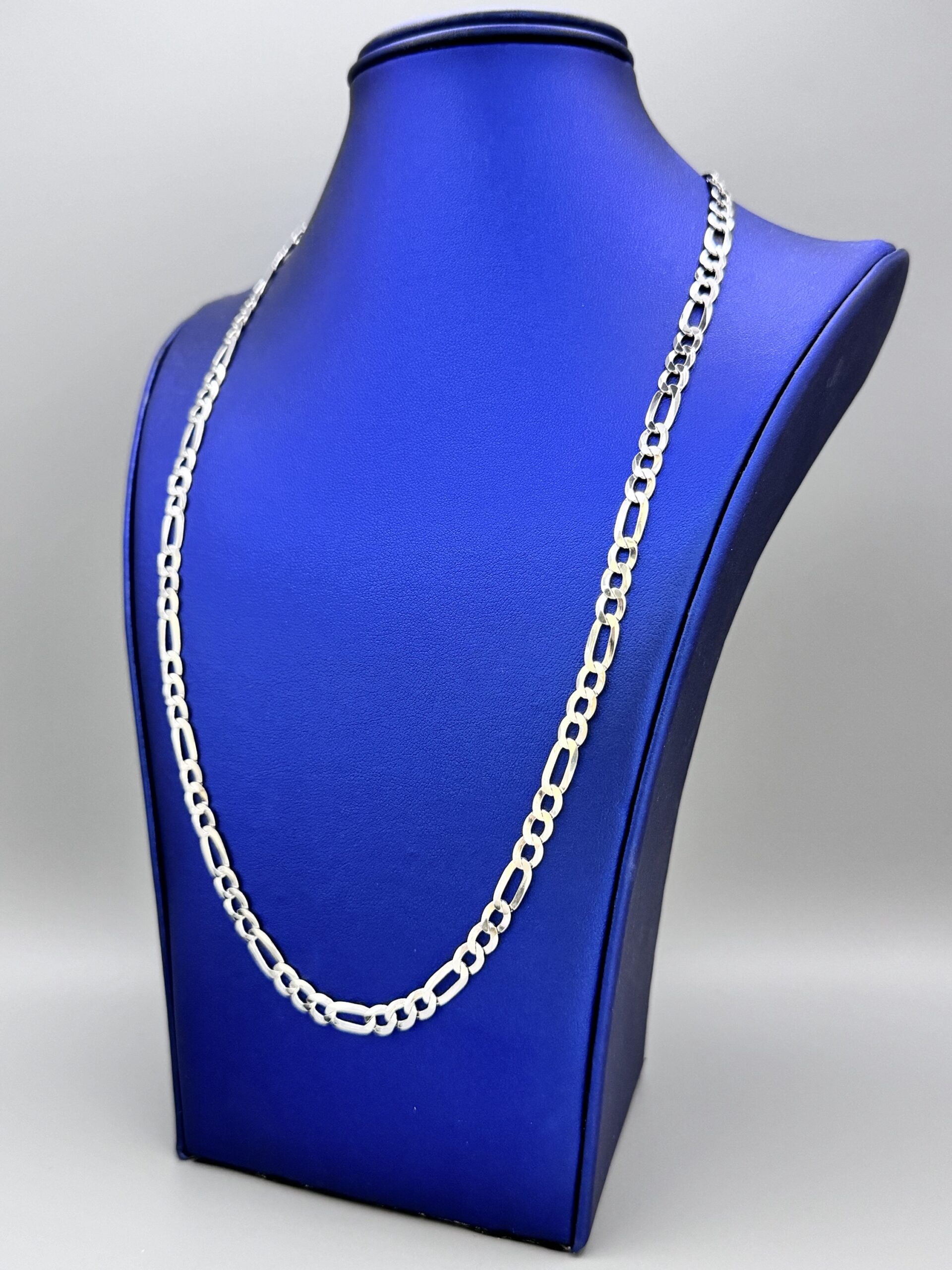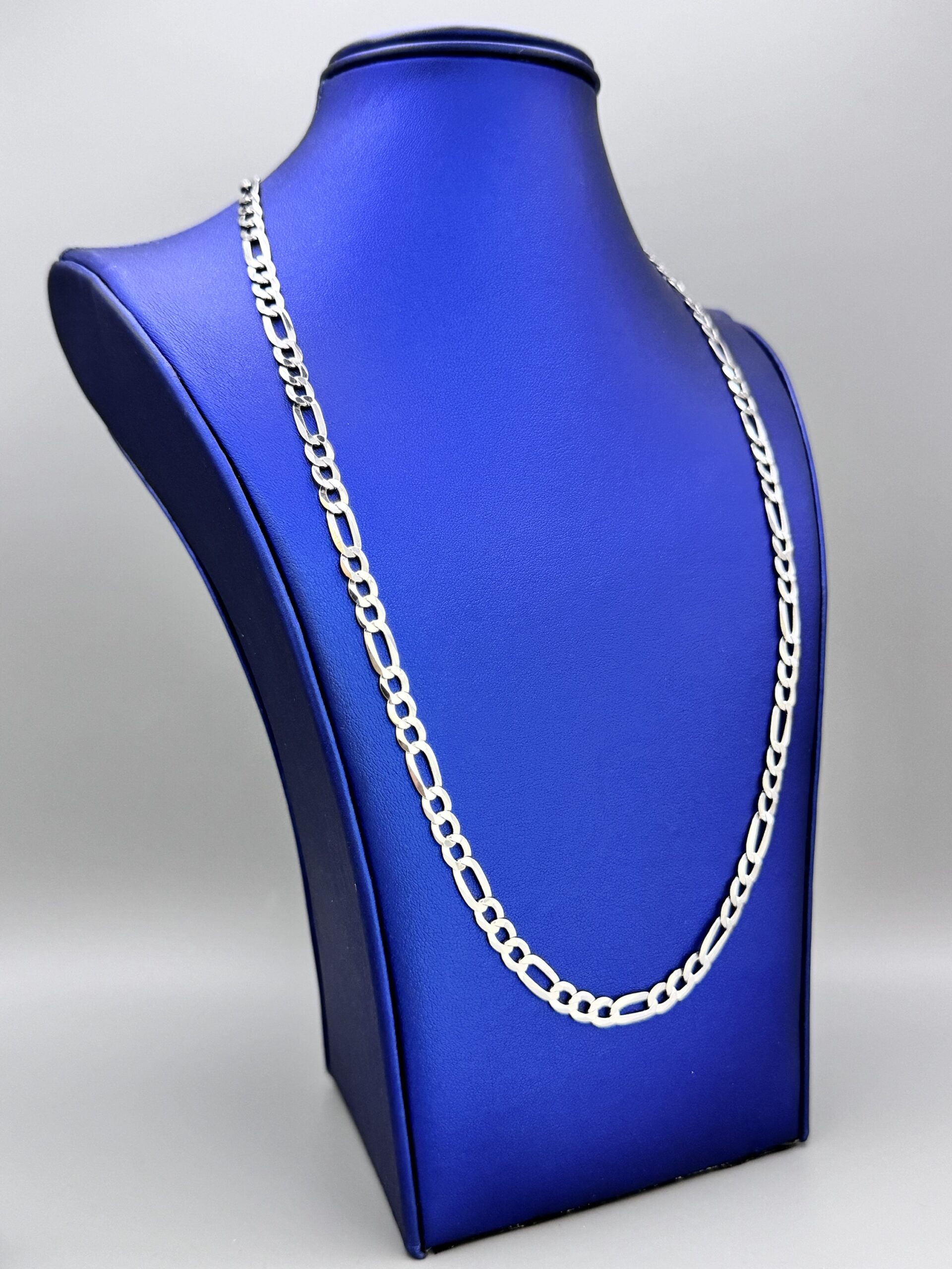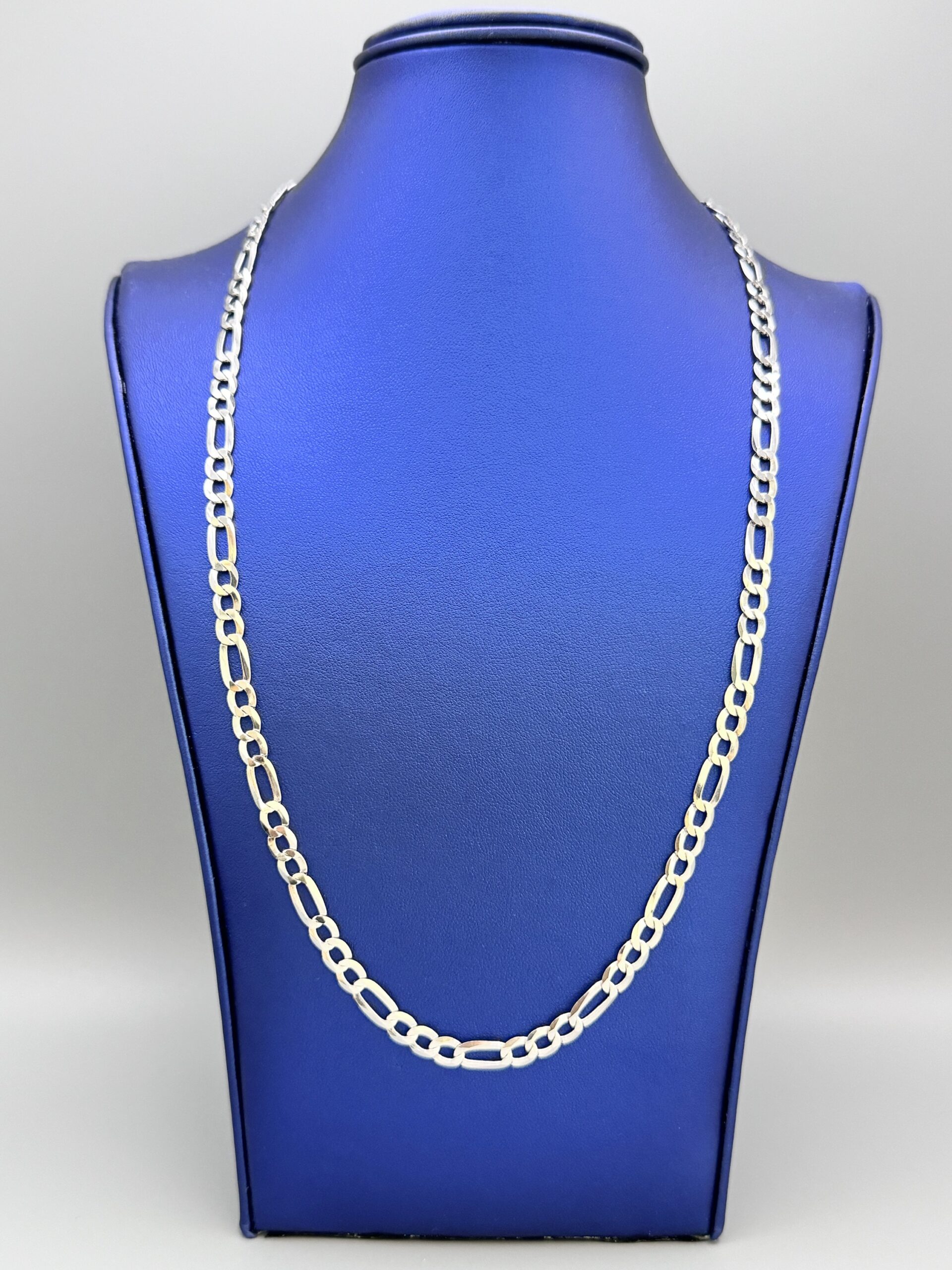 Elevate your style with this 22″ Sterling Silver Figaro Link Necklace, featuring a rhodium white gold finish that resists tarnish. Weighing approximately 15.2 grams, it’s the perfect accessory for any occasion.