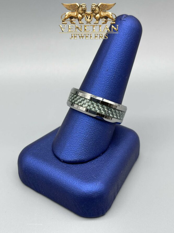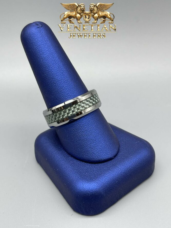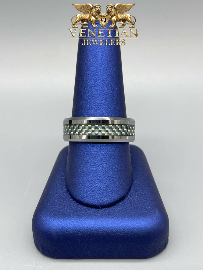 Tungsten Carbide Mens Wedding Band With Carson Fiber Design In Middle 8MM Available In Size “8 /”9 / “11 Sizes