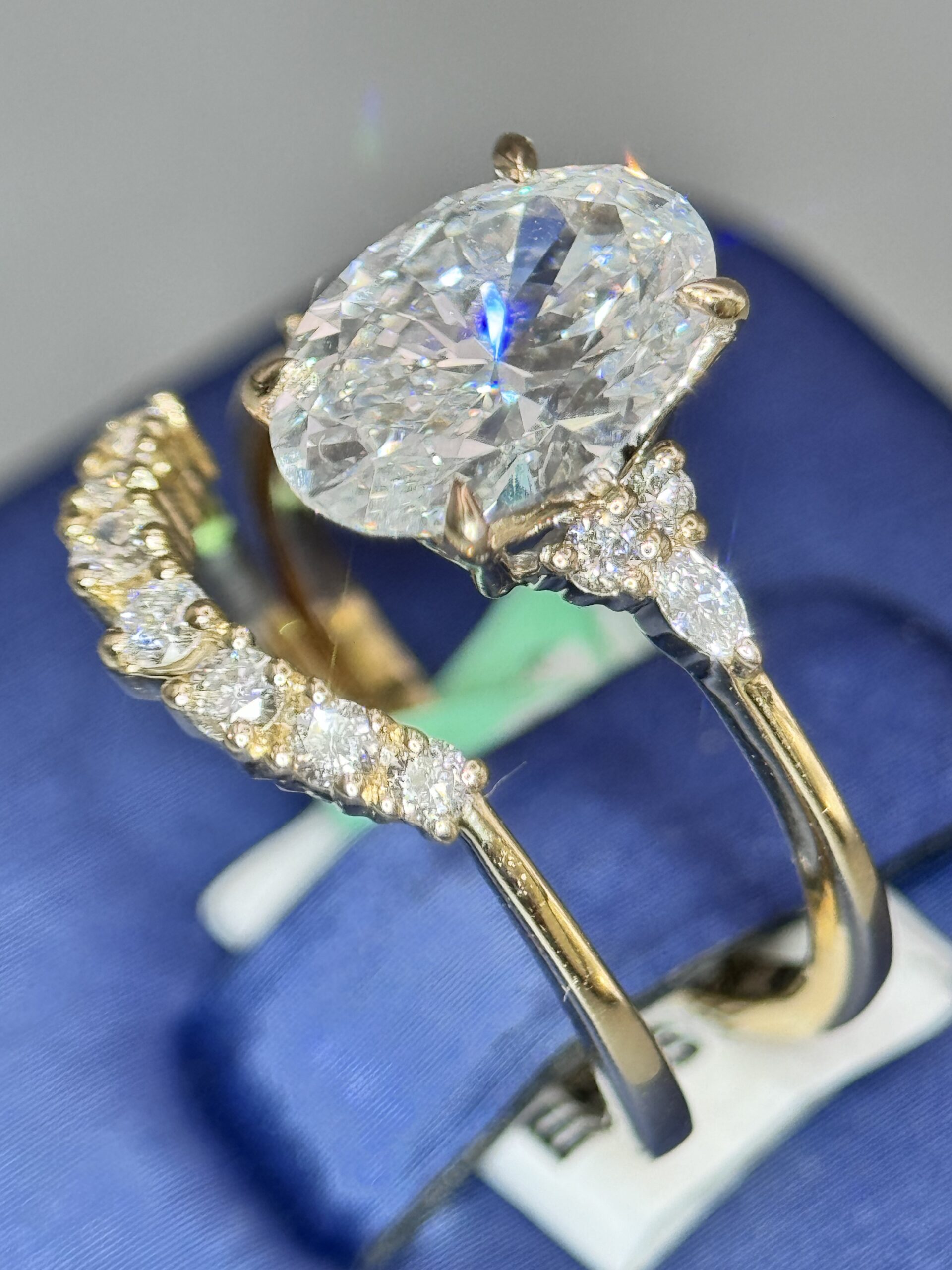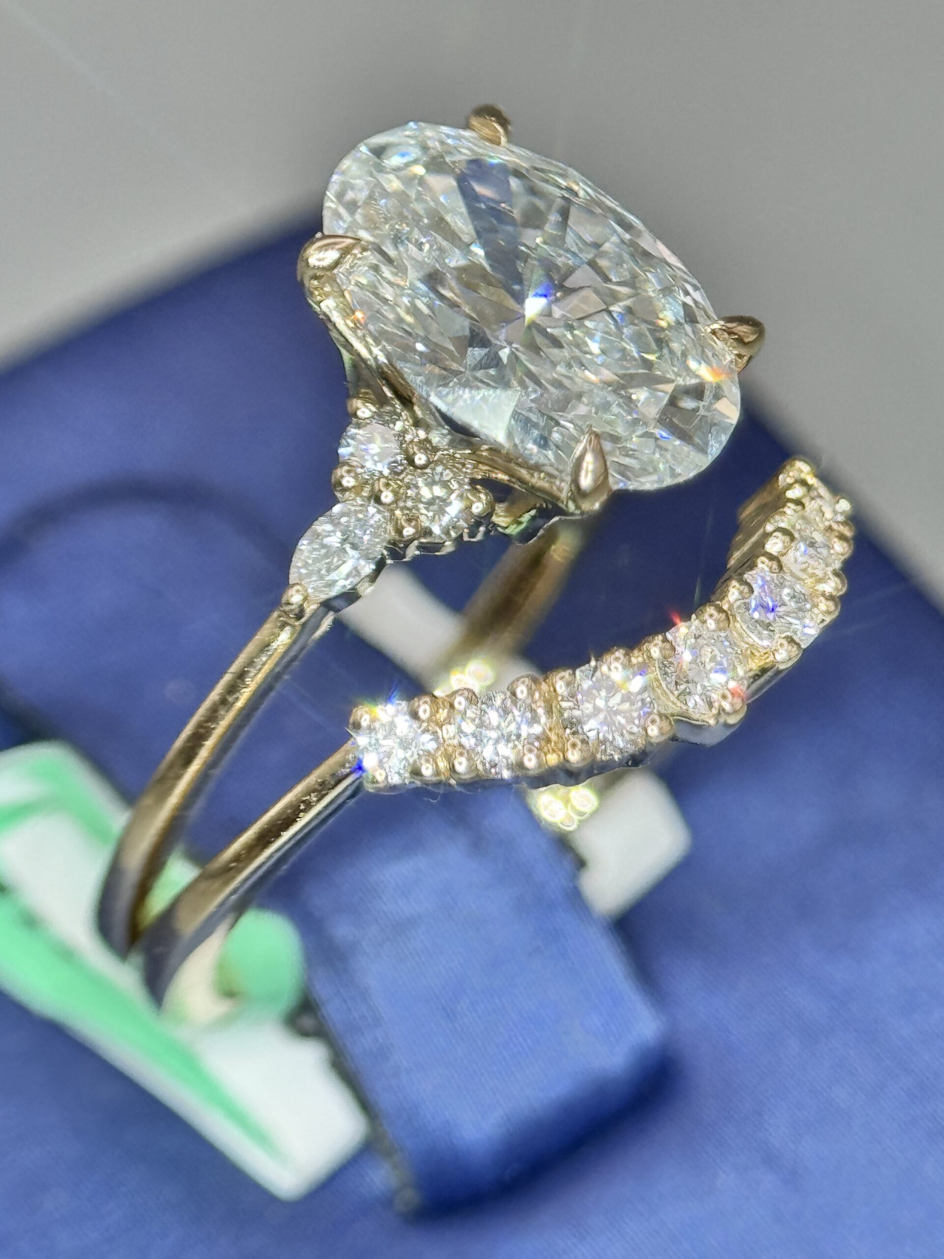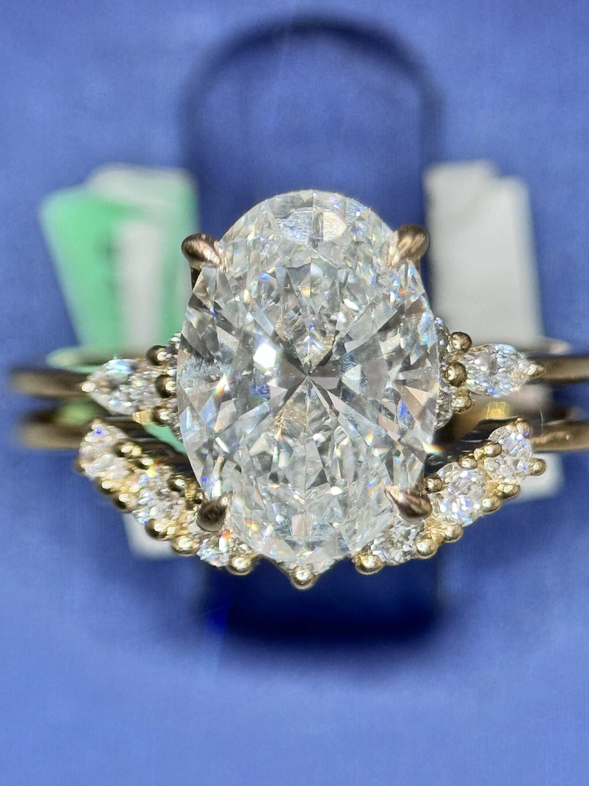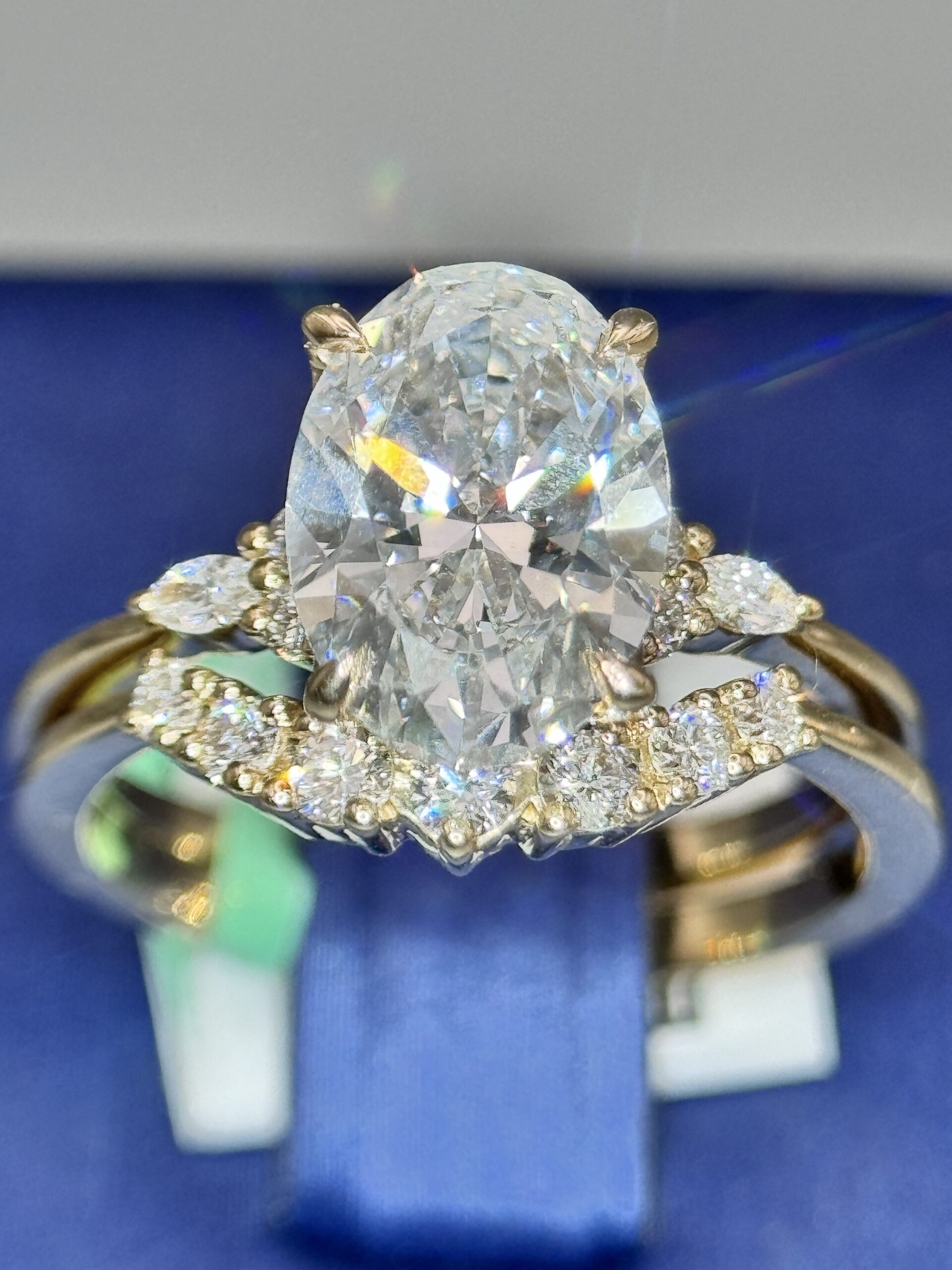 14KT Gold 2.89CT LabGrown OvalCut Diamond Ring With RoundCut N Diamonds Band Concord Style Center Solitaire 2.50CT VS E-F Color Size 7 Sizing Also Available Upon Request Certified Piece