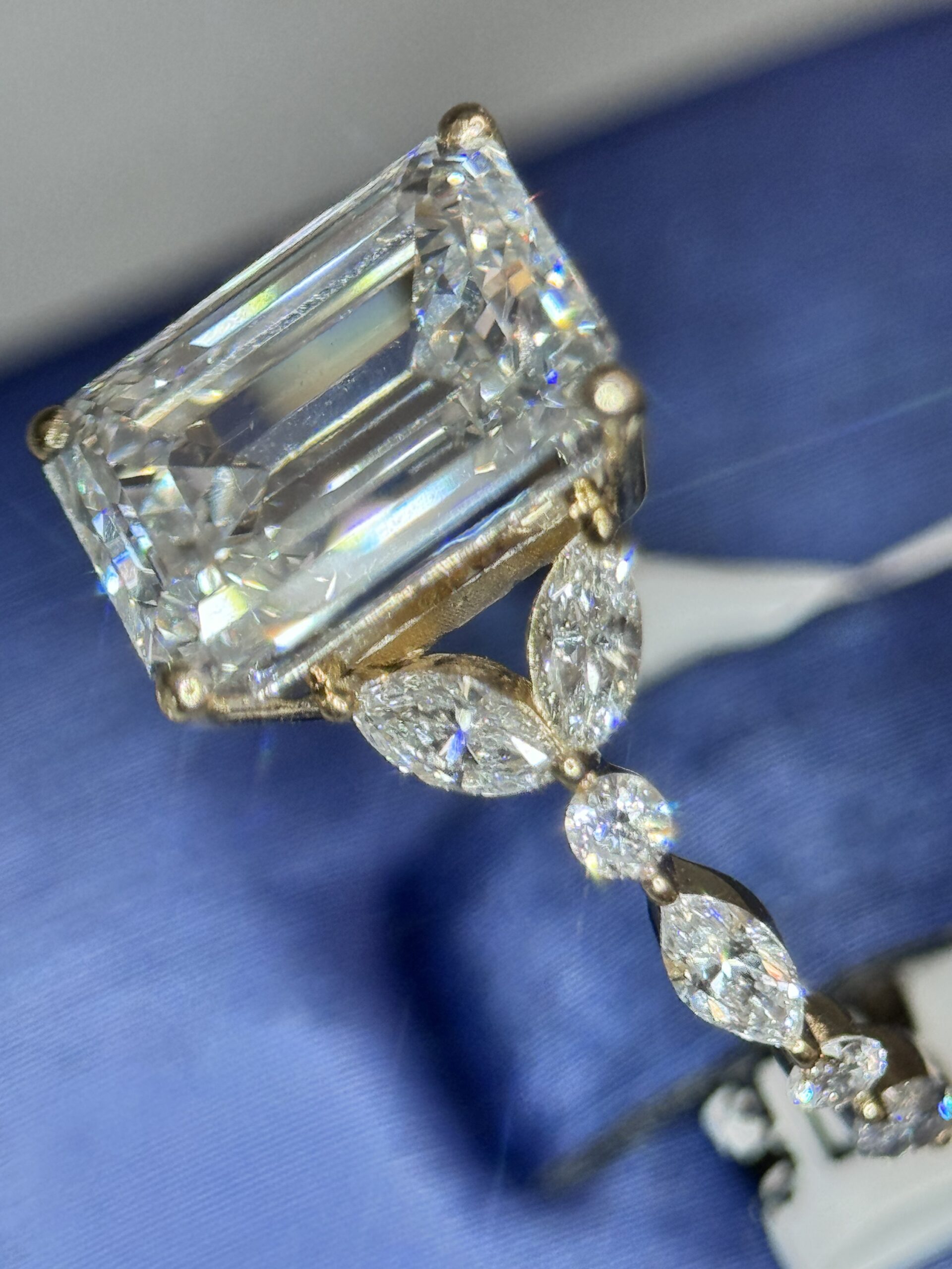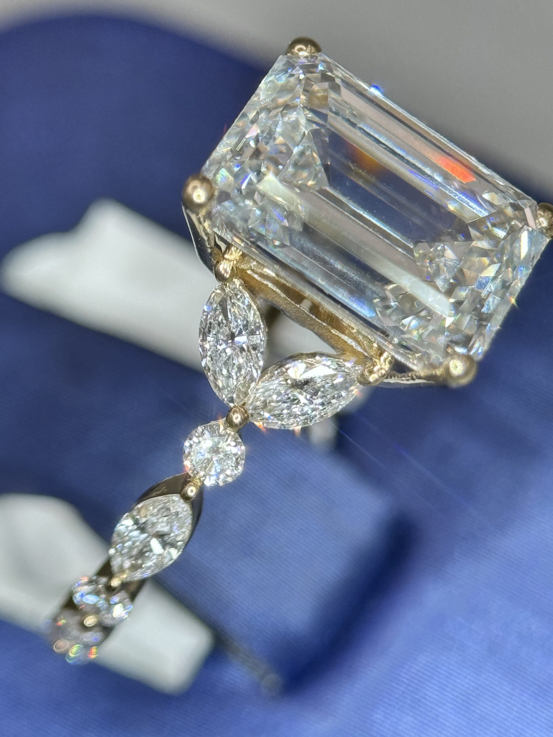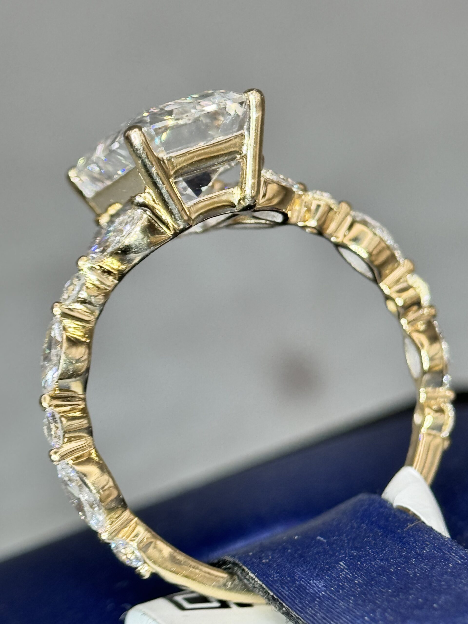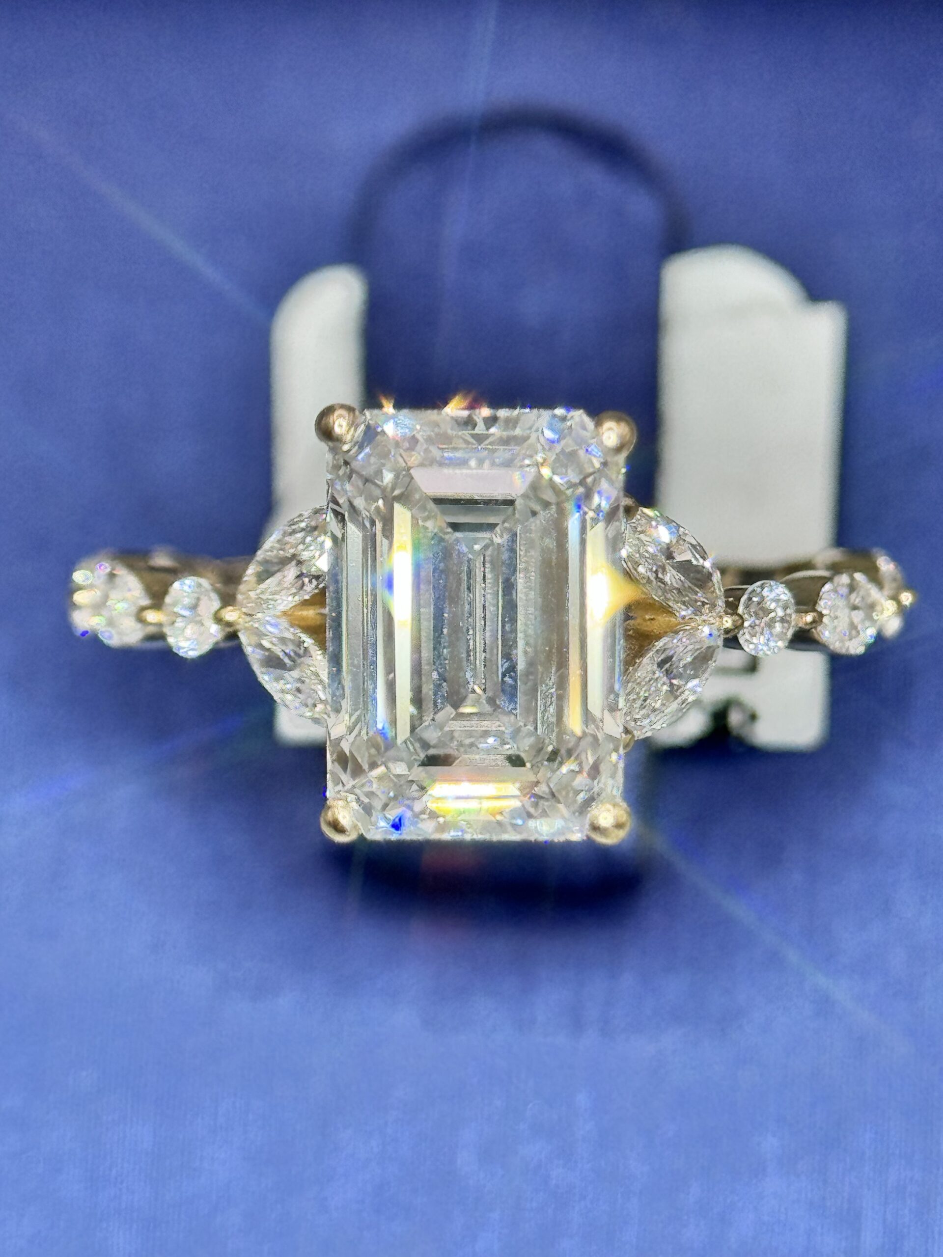 14KT Gold 3.65CT LabGrown EmeraldCut Diamond Ring With RoundCut N Marquee Diamonds On The Sides Center Solitaire 3.00CT VS E-F Color Size 7 Sizing Also Available Upon Request Certified Piece