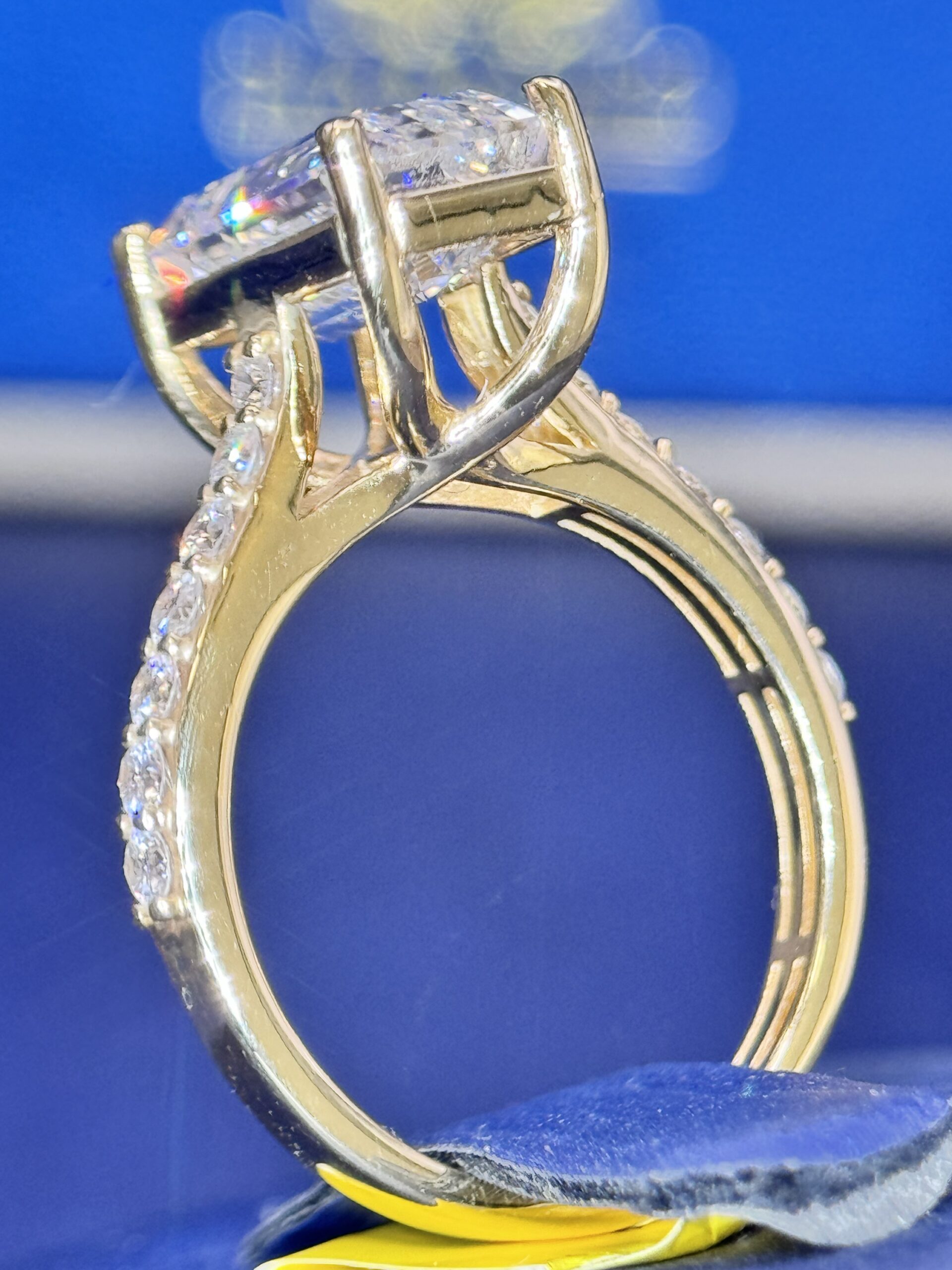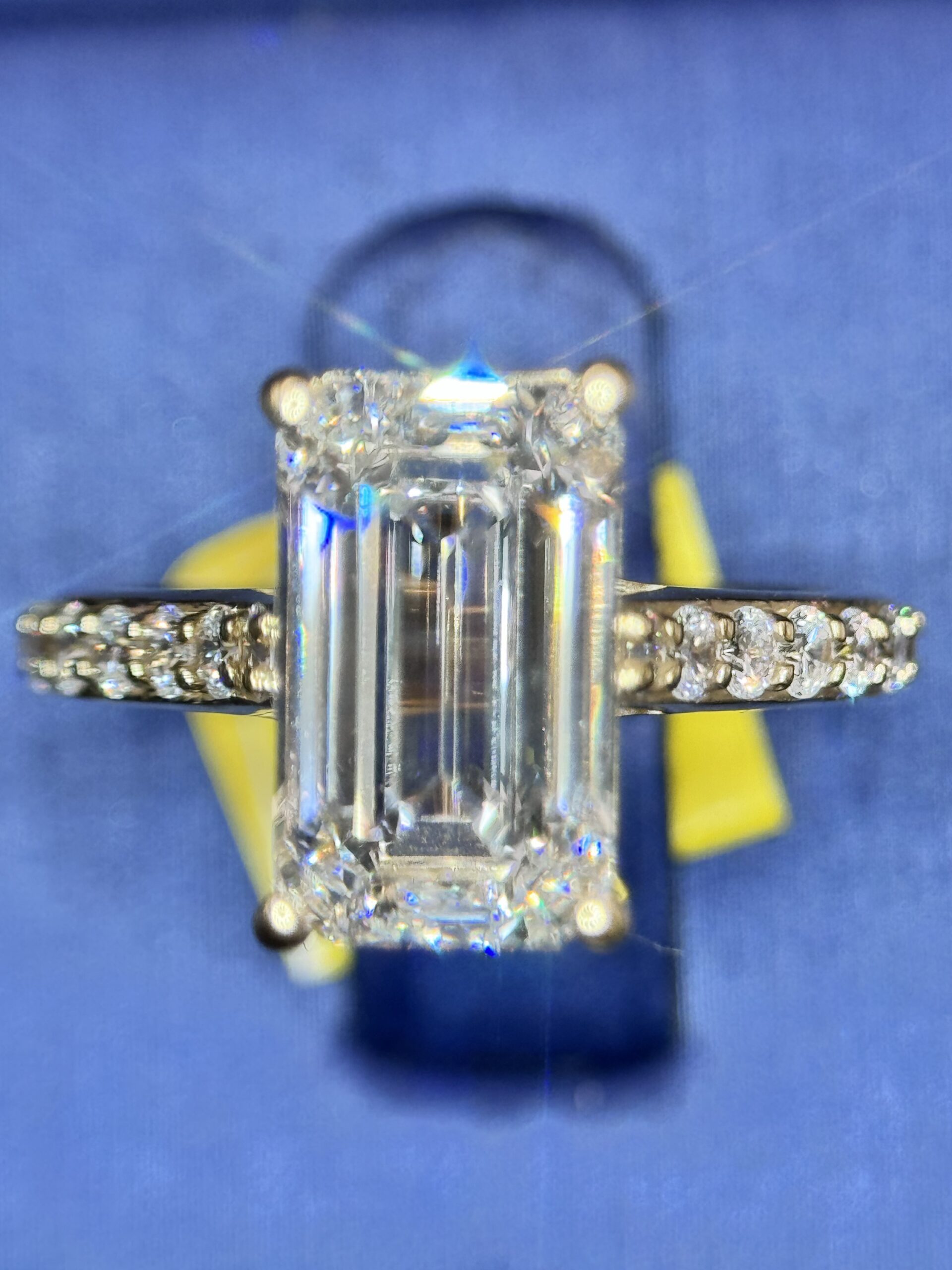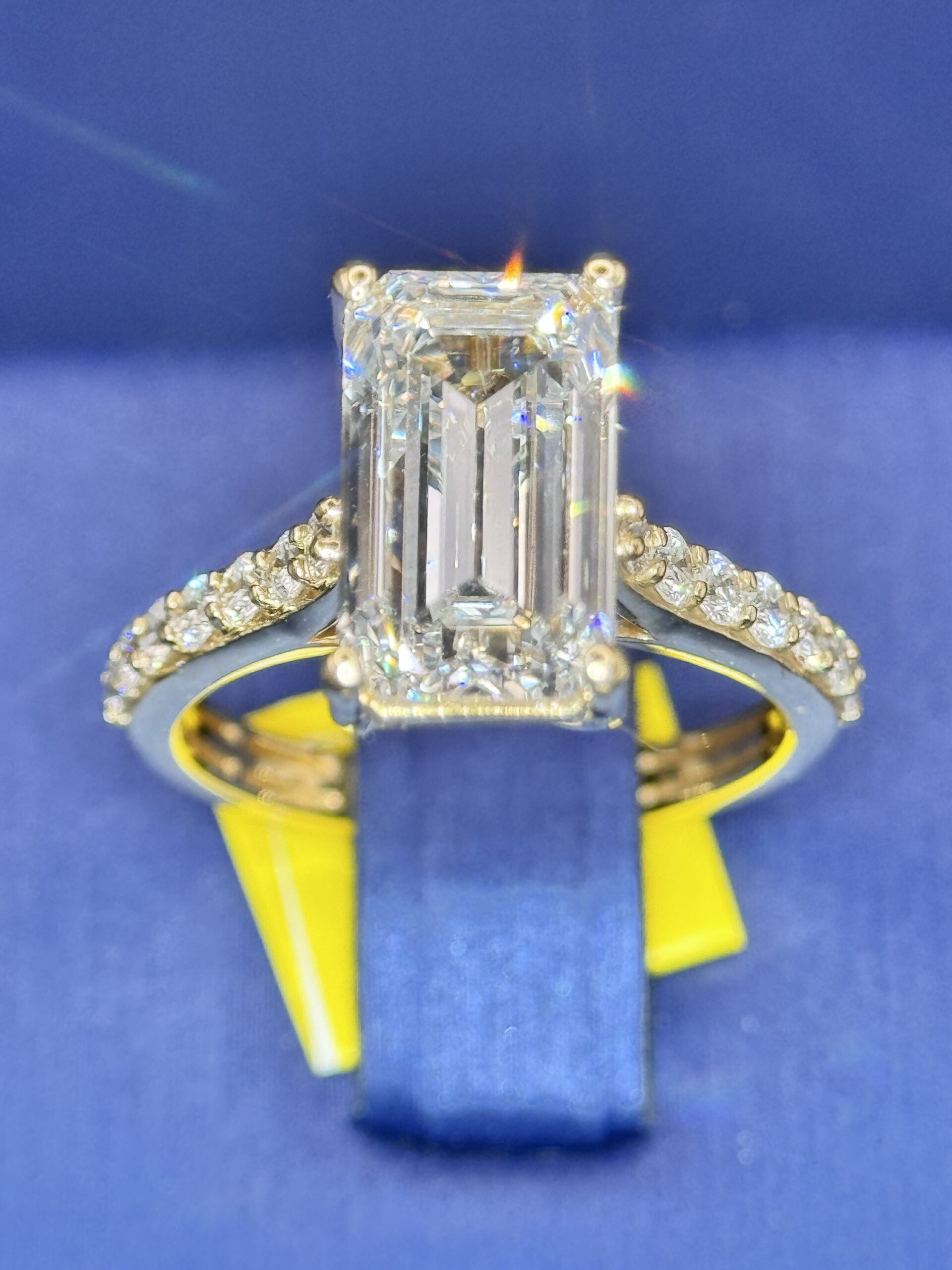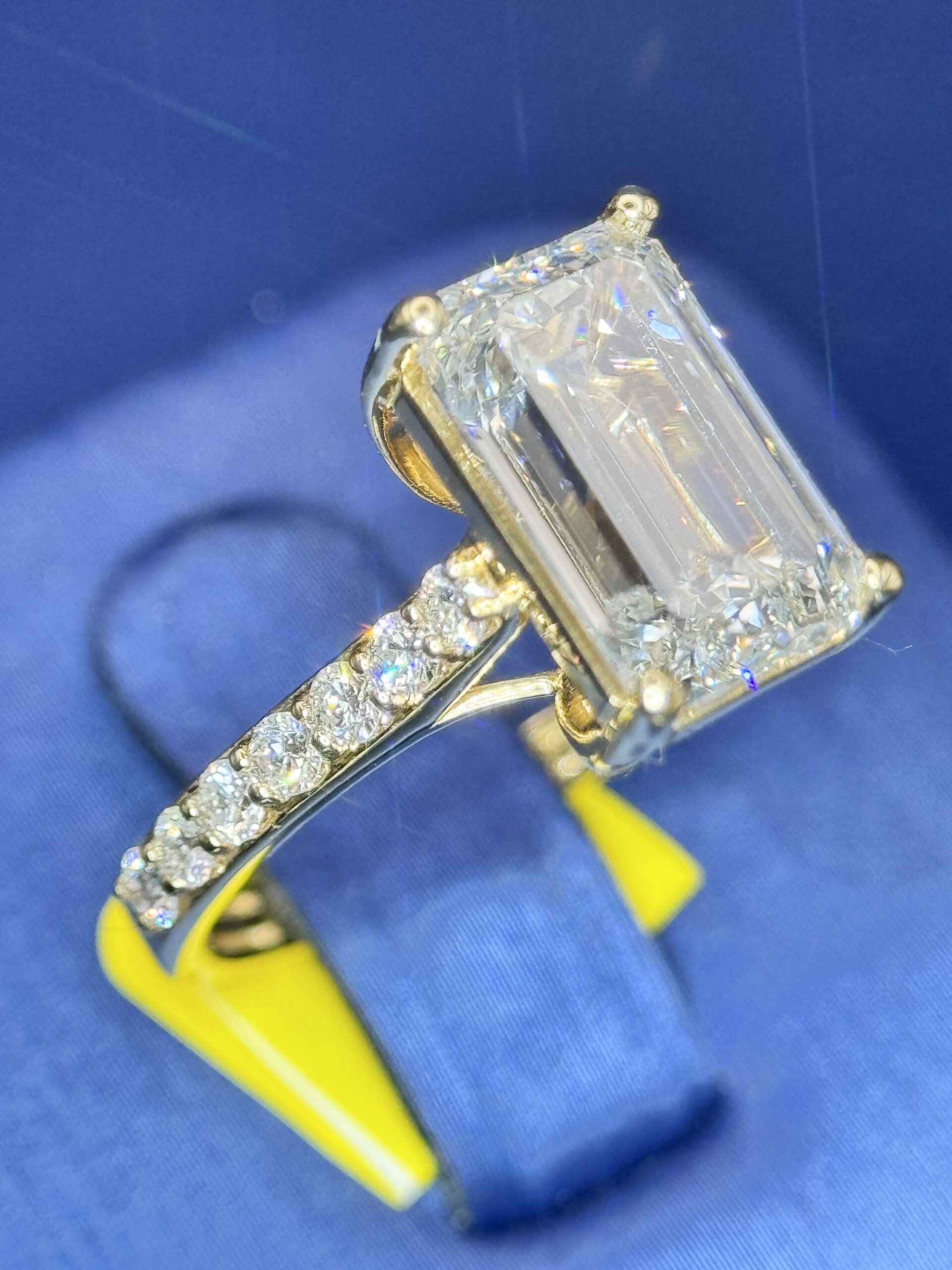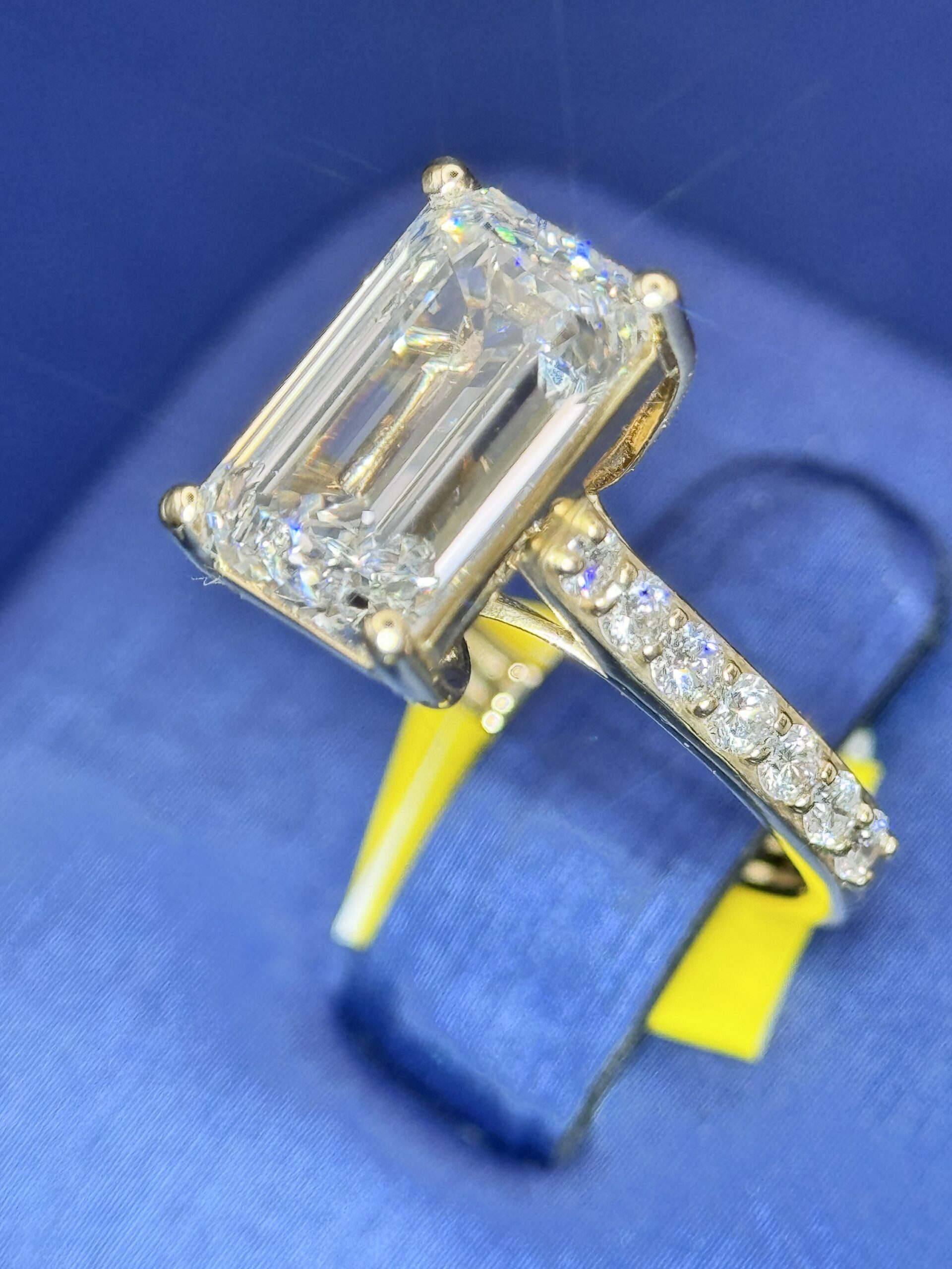 14KT Gold 4.89CT LabGrown Diamond EmeraldCut Ring Center Solitaire 4.02CT RoundCut Diamonds On The Side Size 7 Approx Gold Weight 3.8 Gram Comes With IGI Certified
