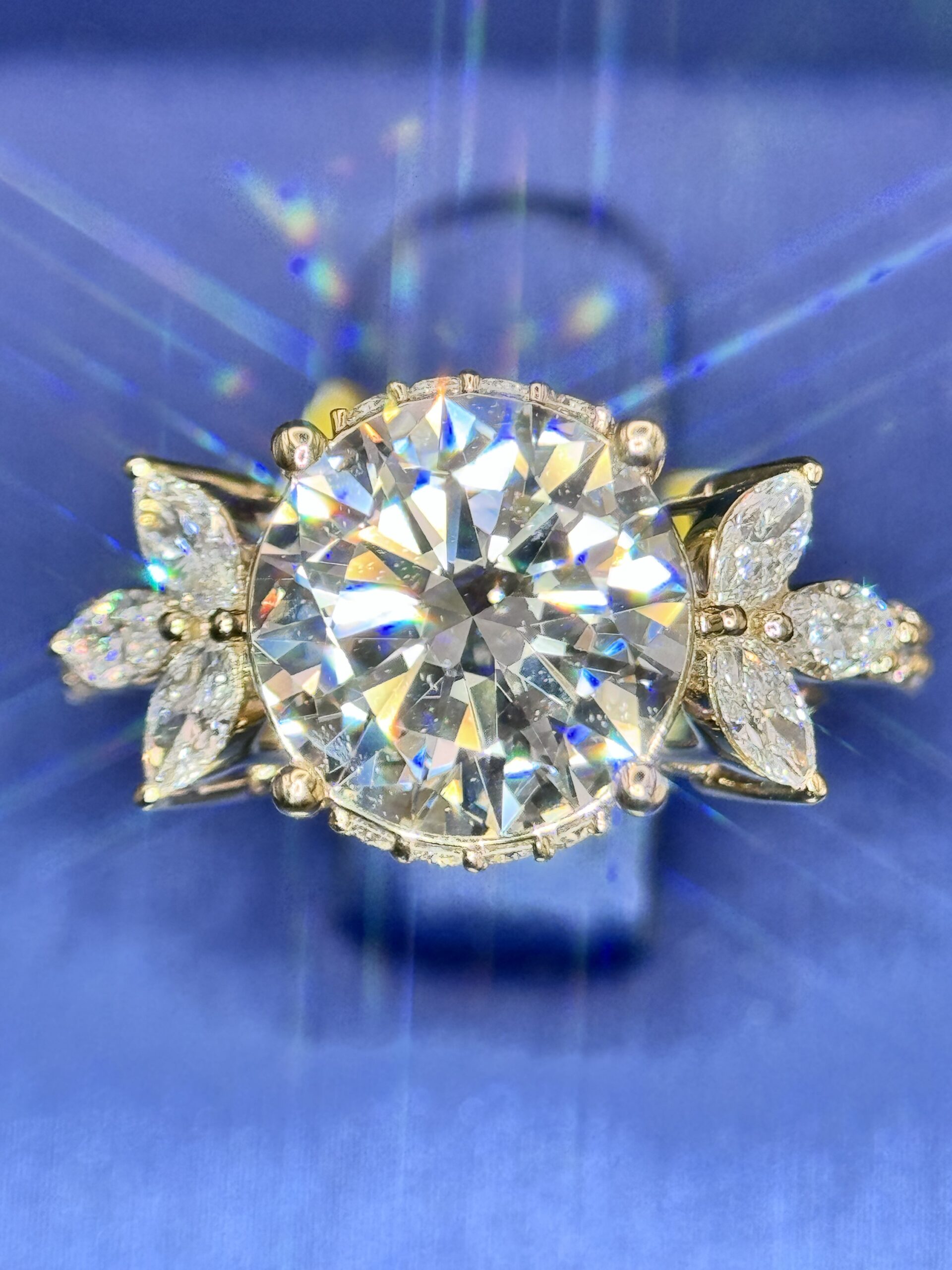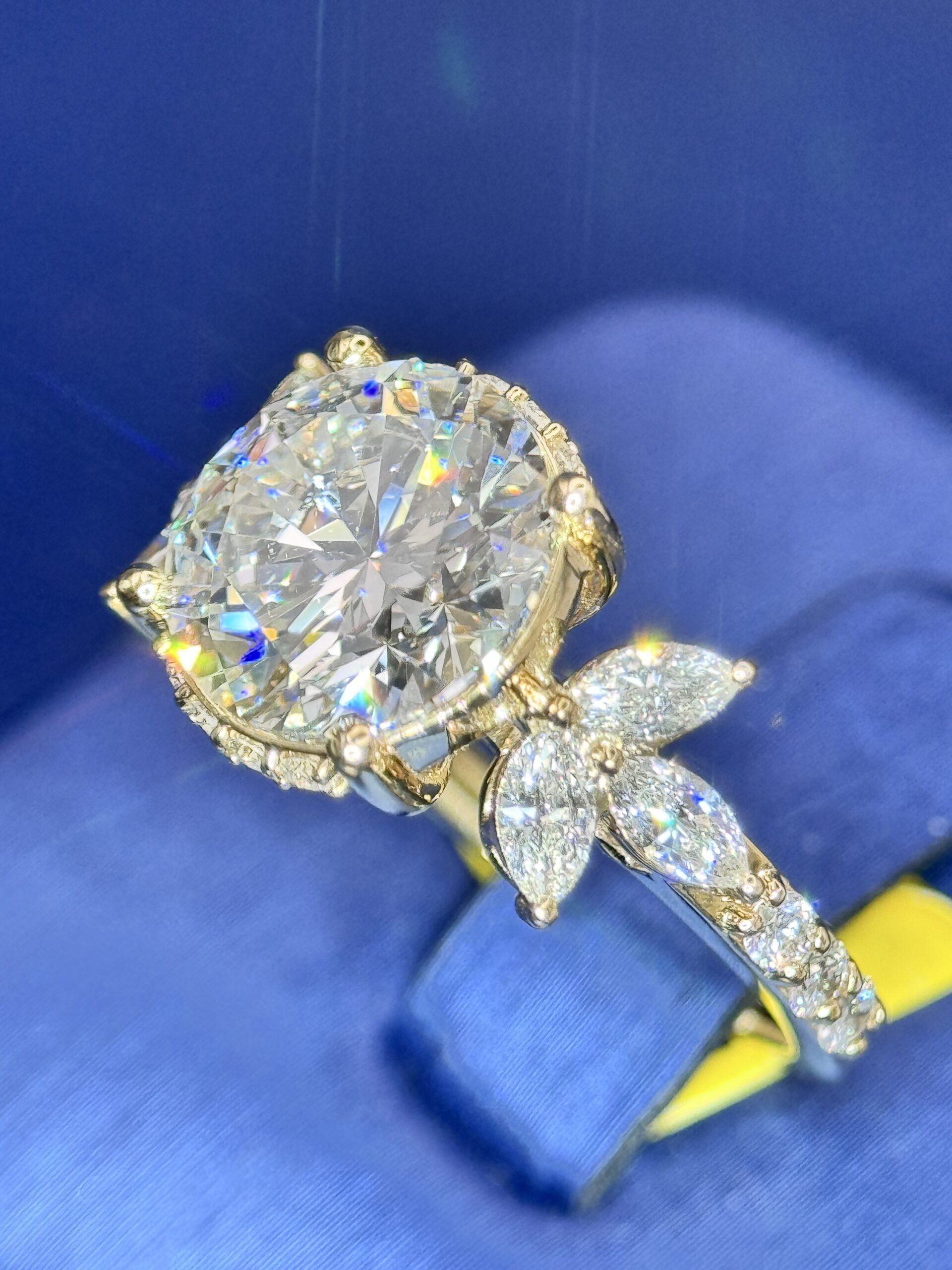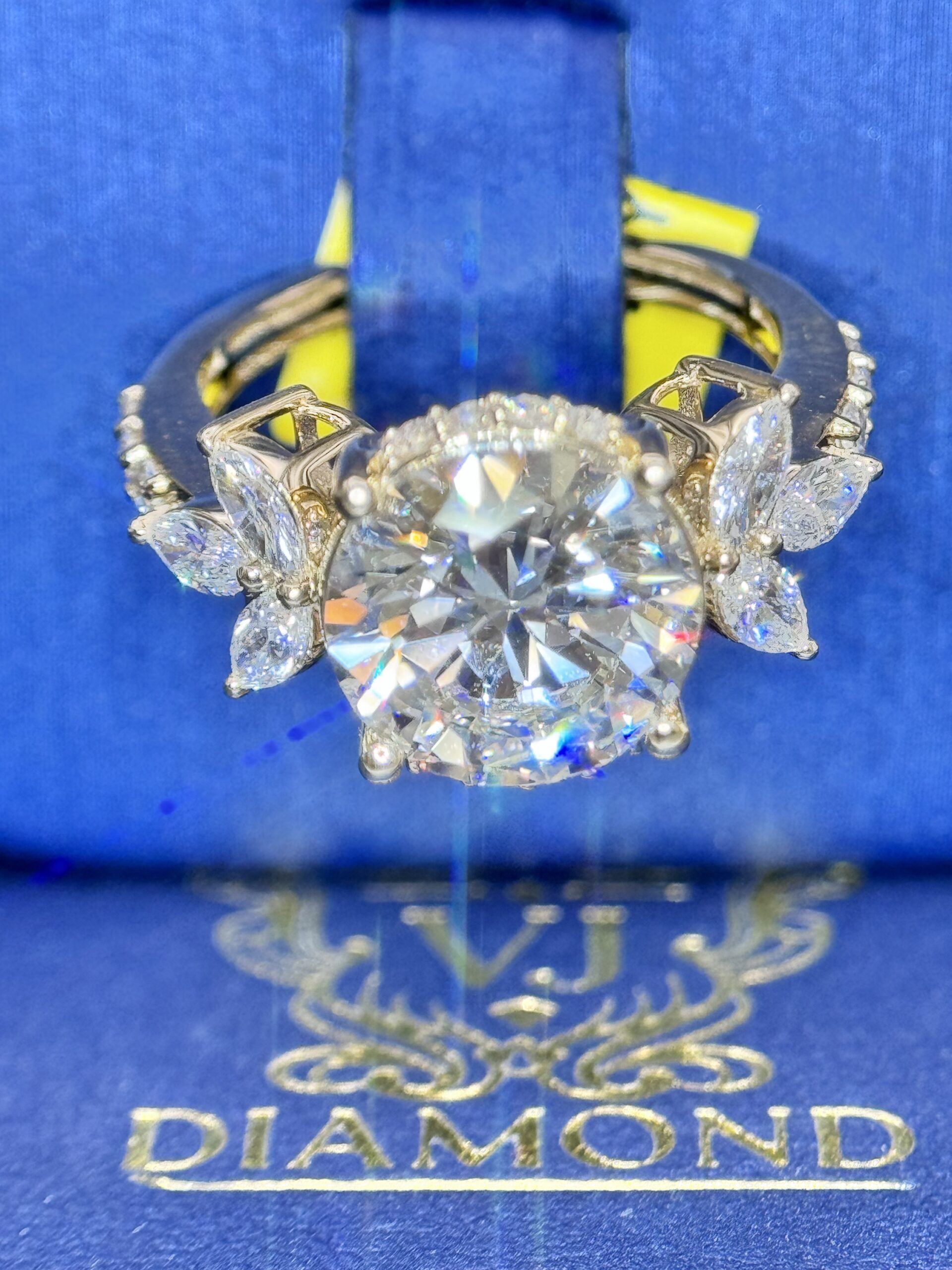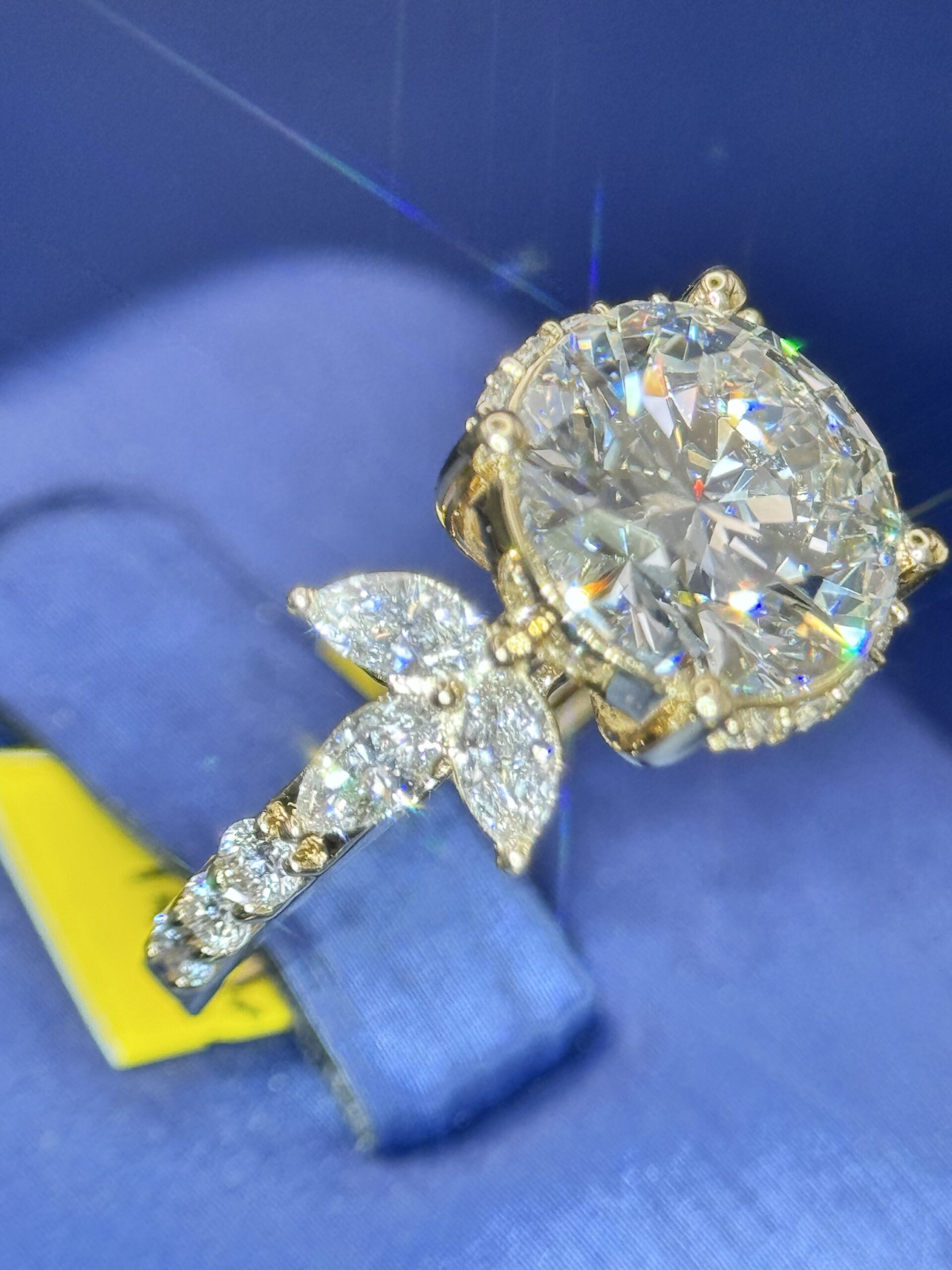 14KT Gold 4.89CT LabGrown Diamond RoundCut Ring Center Solitaire 4.00CT RoundCut And Marquee Diamonds On The Side Size 7 Approx Gold Weight 3.8 Gram Comes With IGI Certified