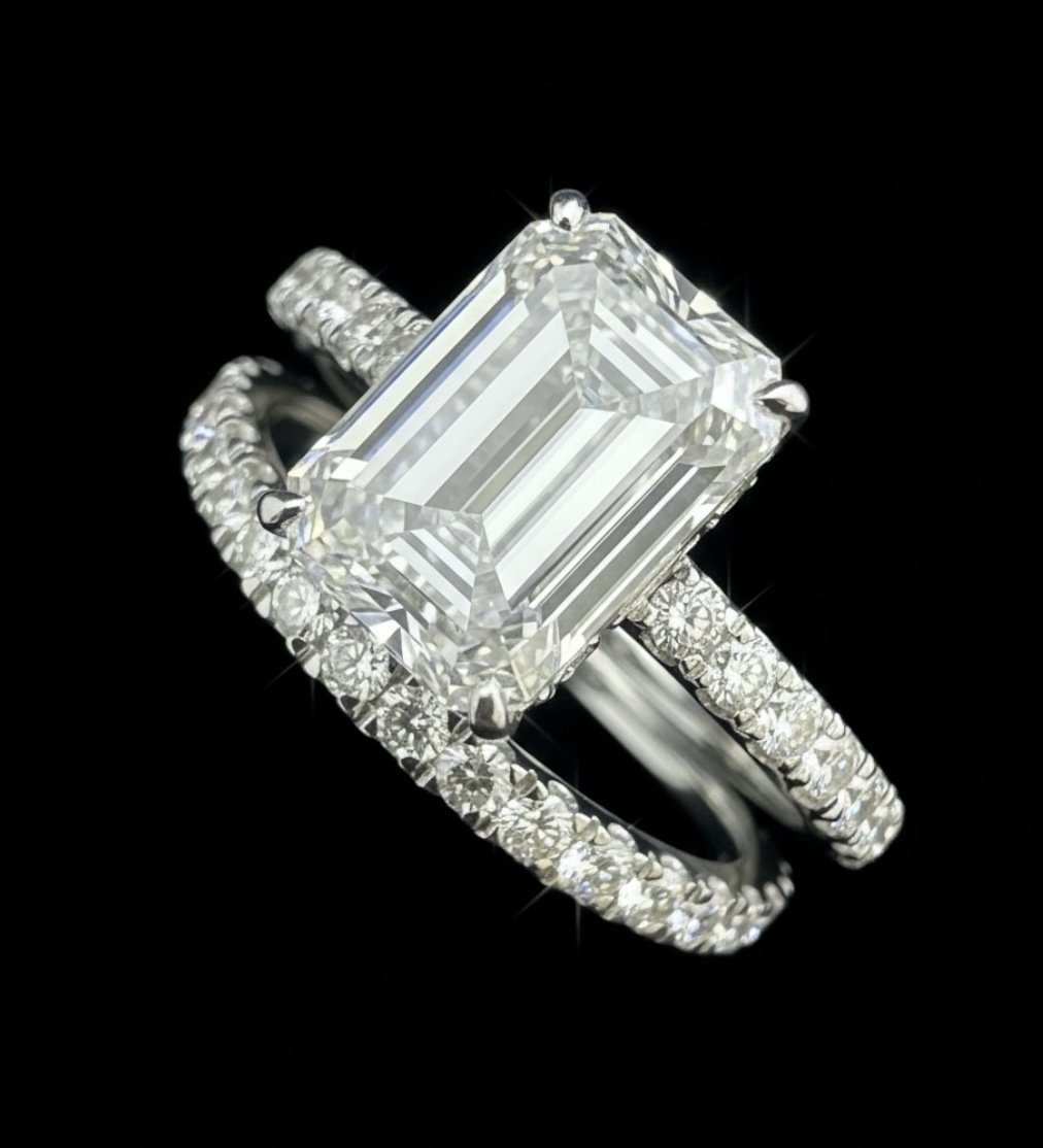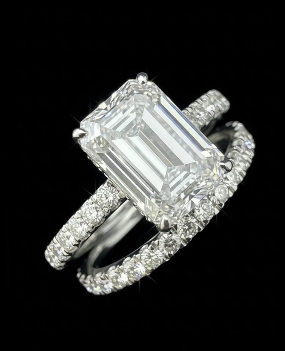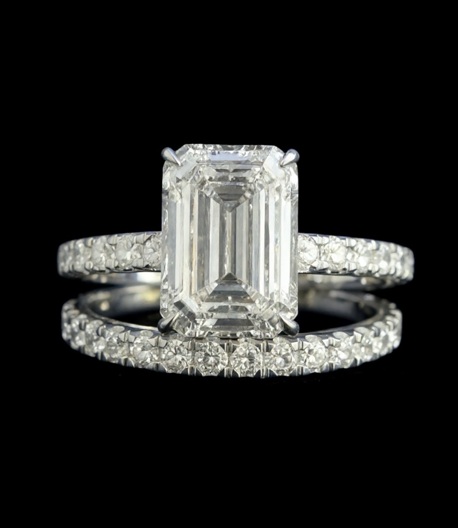 14KT W/Gold 3.19CT EmeraldCut Diamond Bridal Set Size 7 Sizing Available Approx Gold Weight 4.8 Gram 2.01 CT Center Stone 2MM Diamond Band 10MM Hidden Halo Head VVS Clarity