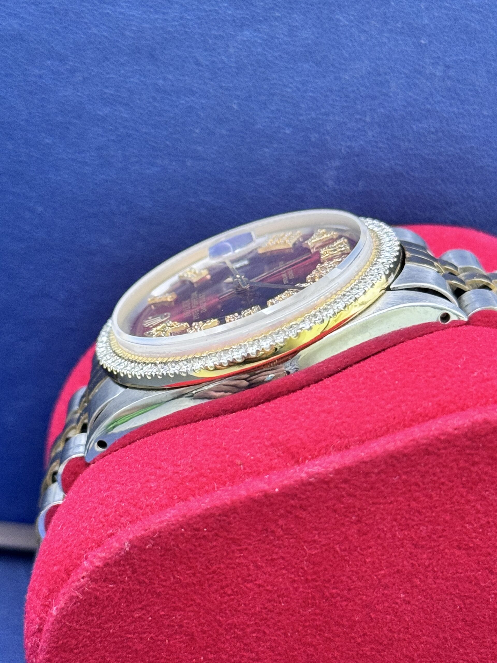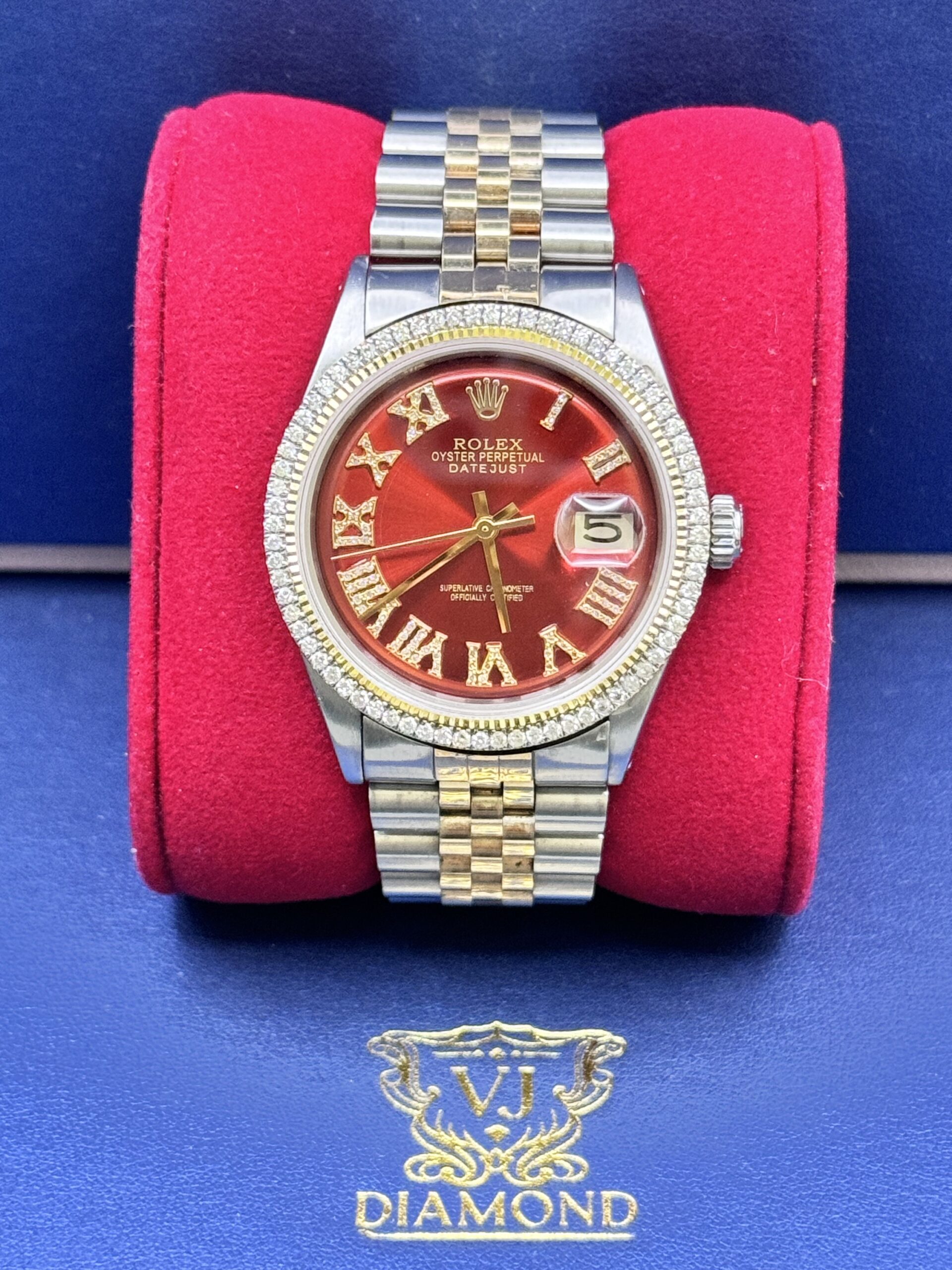 DateJust 36MM 2.00CT Diamond Bezel With Jubilee Band Roman Numeral Red Face Ref No 1601 year 1969 Well Serviced Factory Movement After Market Band Dial And Face