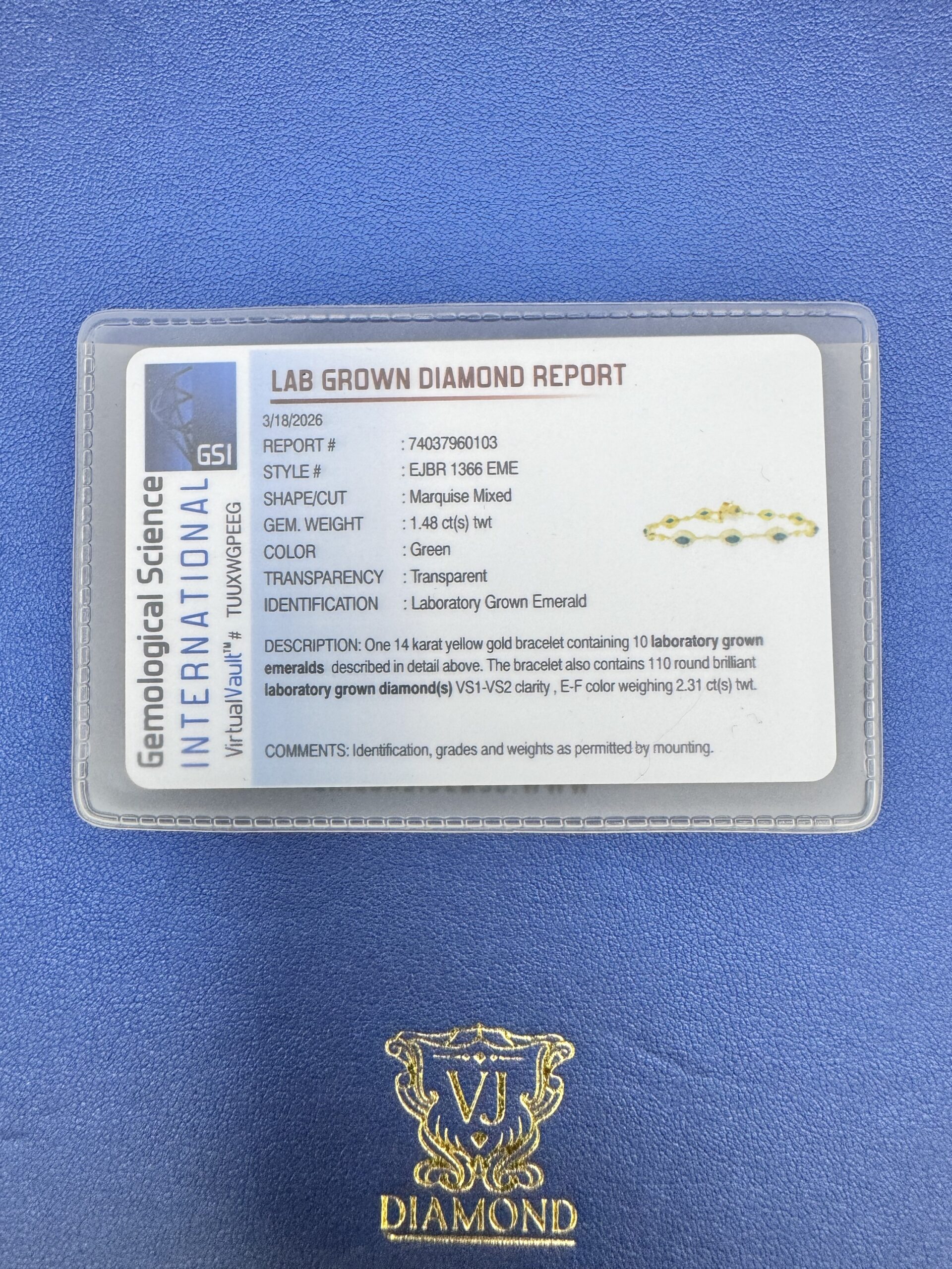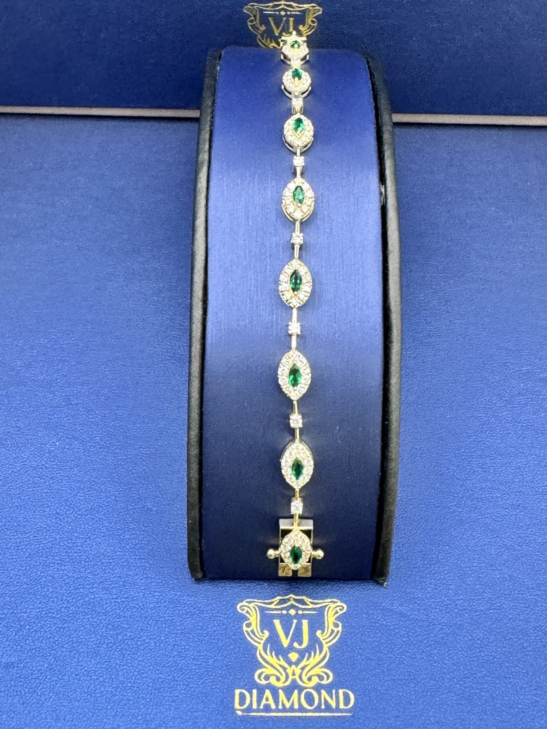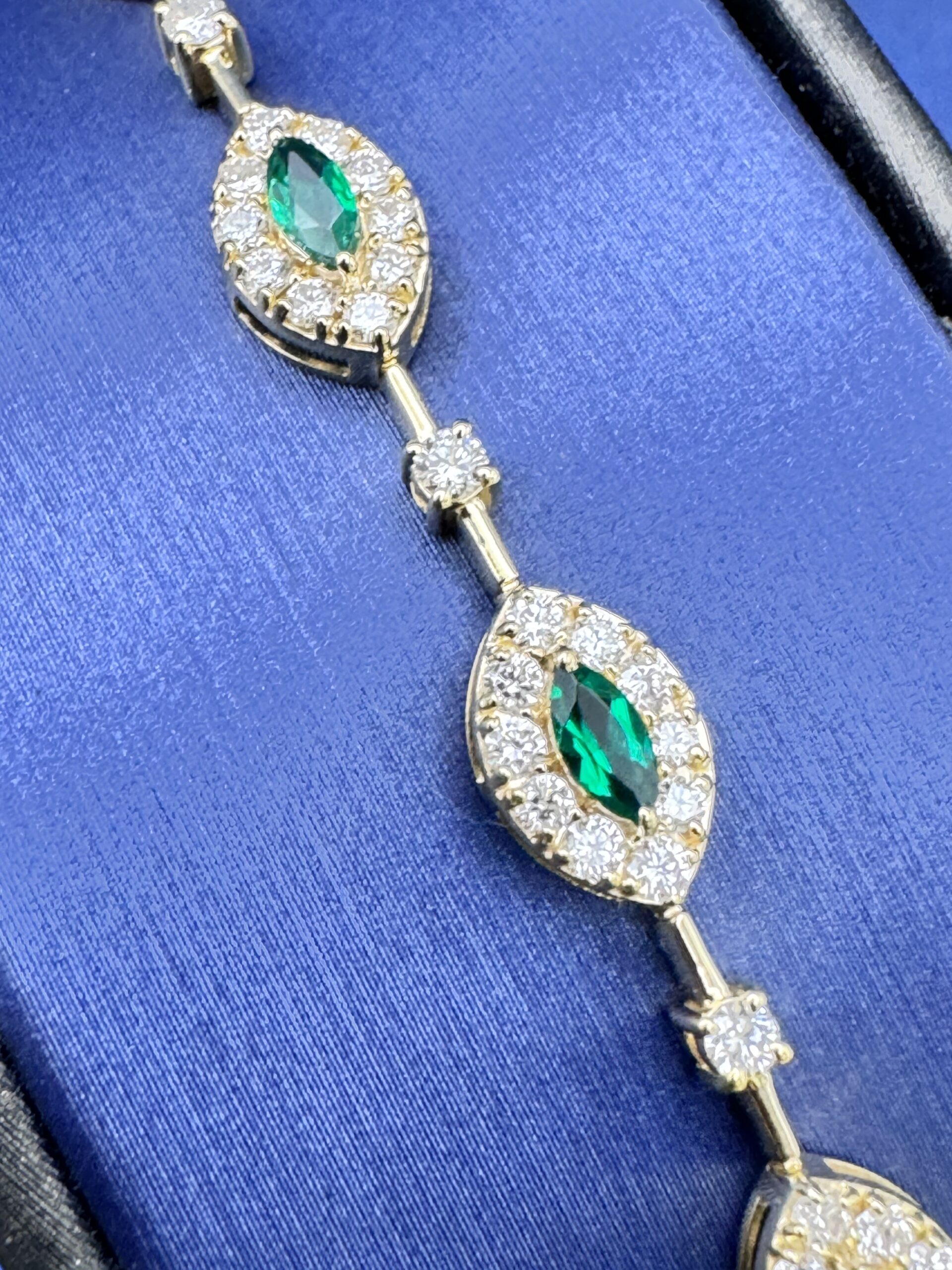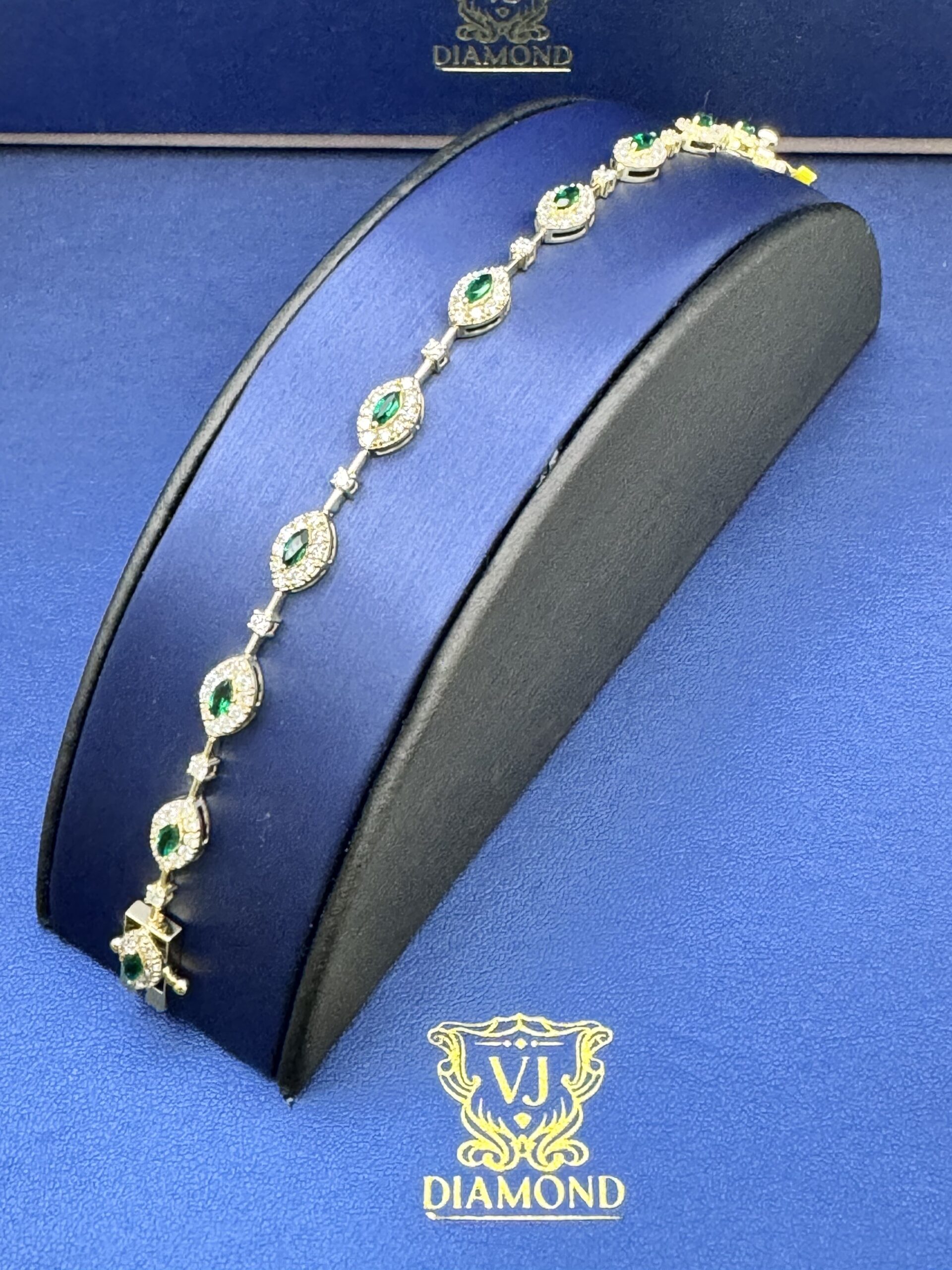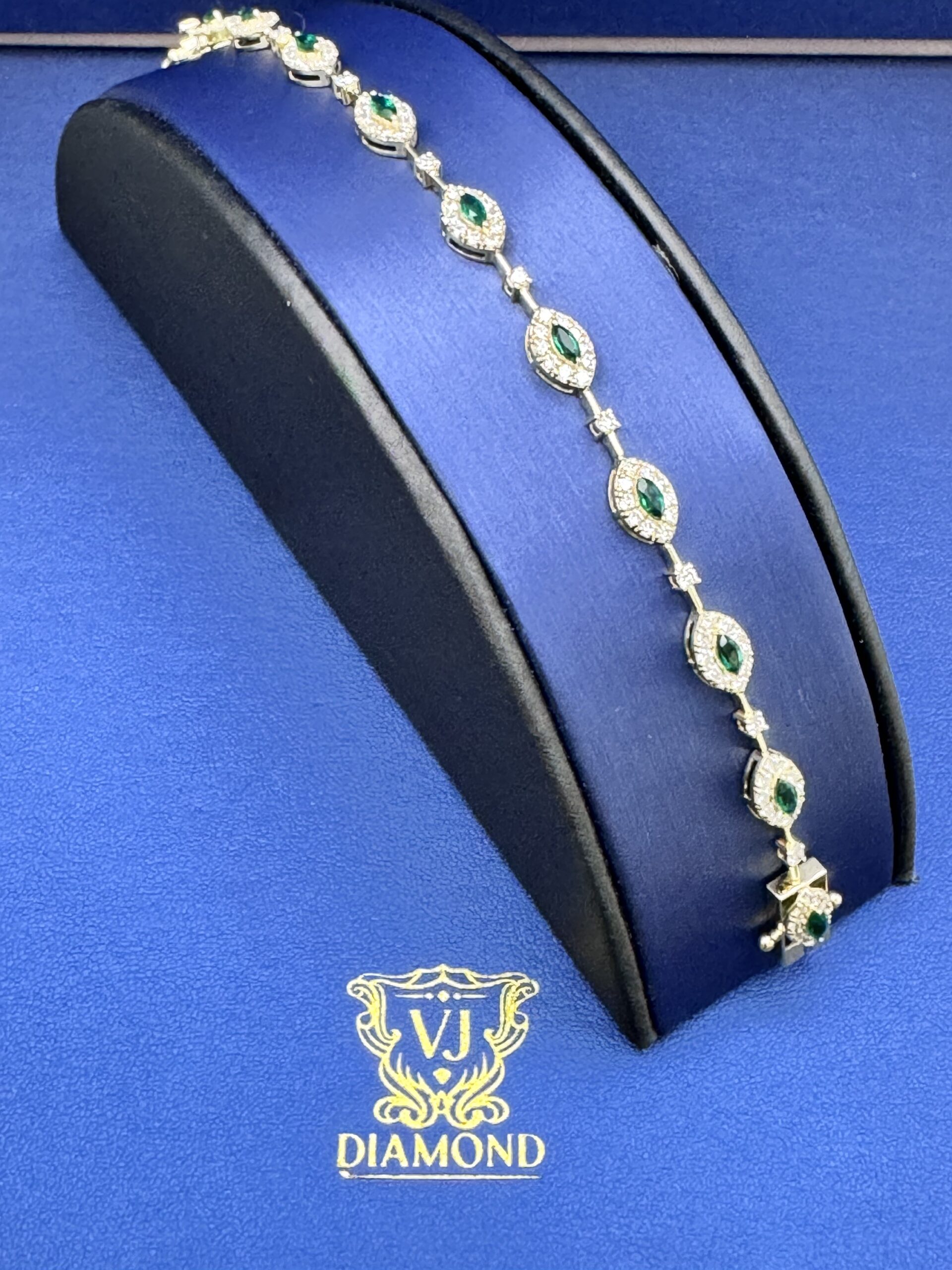 14KT Gold 3.79CT LabGrown Diamond Green Emerald Bracelet Perfect For MothersDay Or Any Occasion 2.31CT RoundCut Diamonds 1.48CT Color VS Clarity Halo Marquee n Diamonds Size 7 Approx Gold Weight 7.8 Gram 6MM Width Comes With Certification