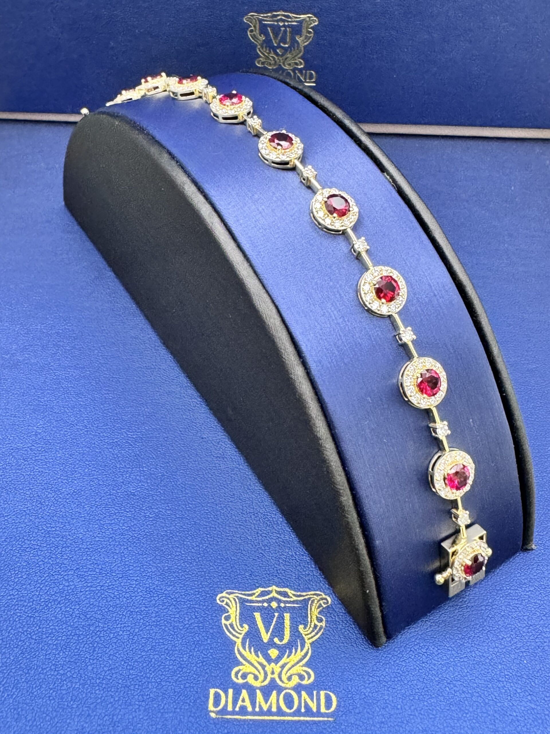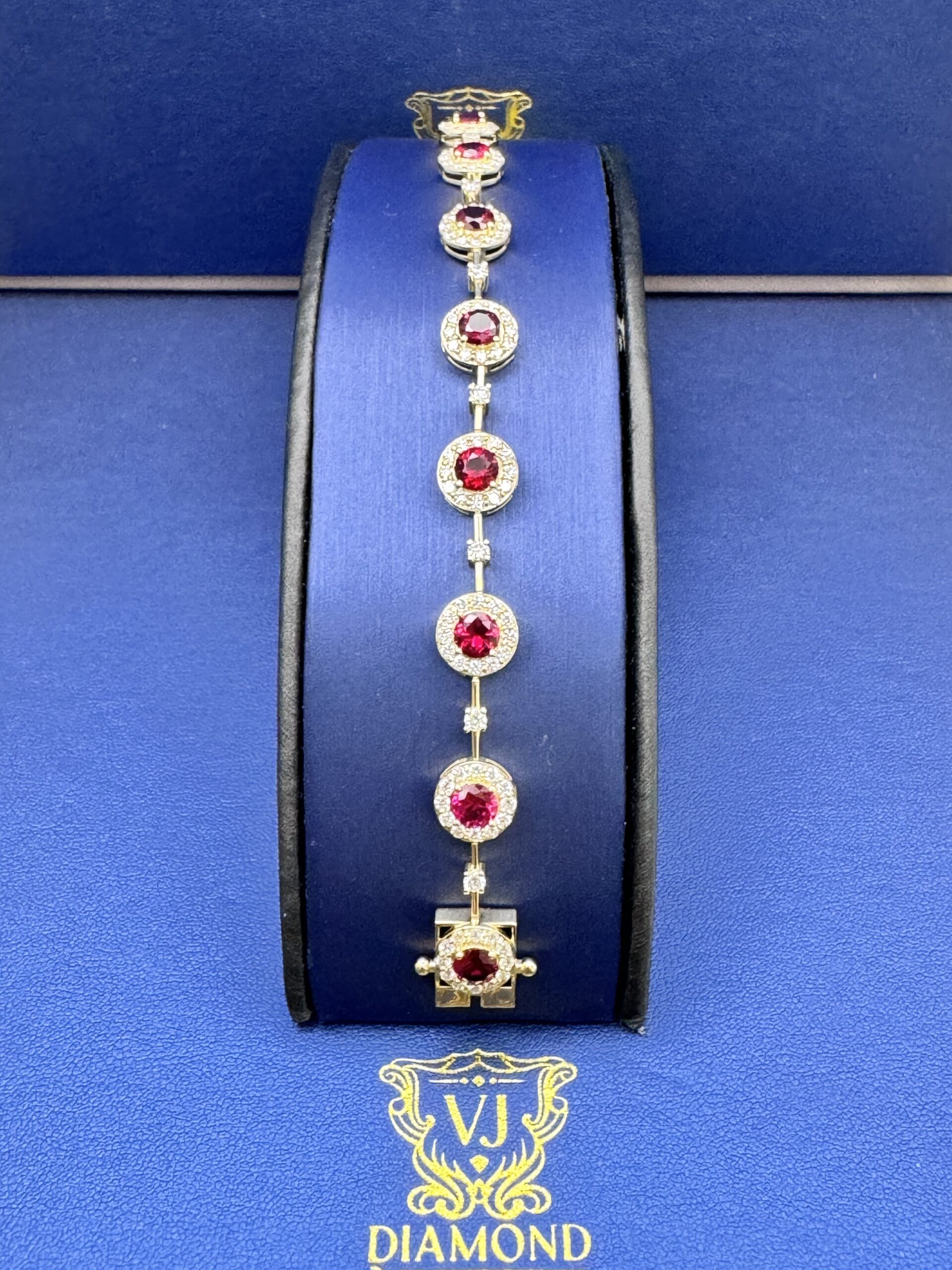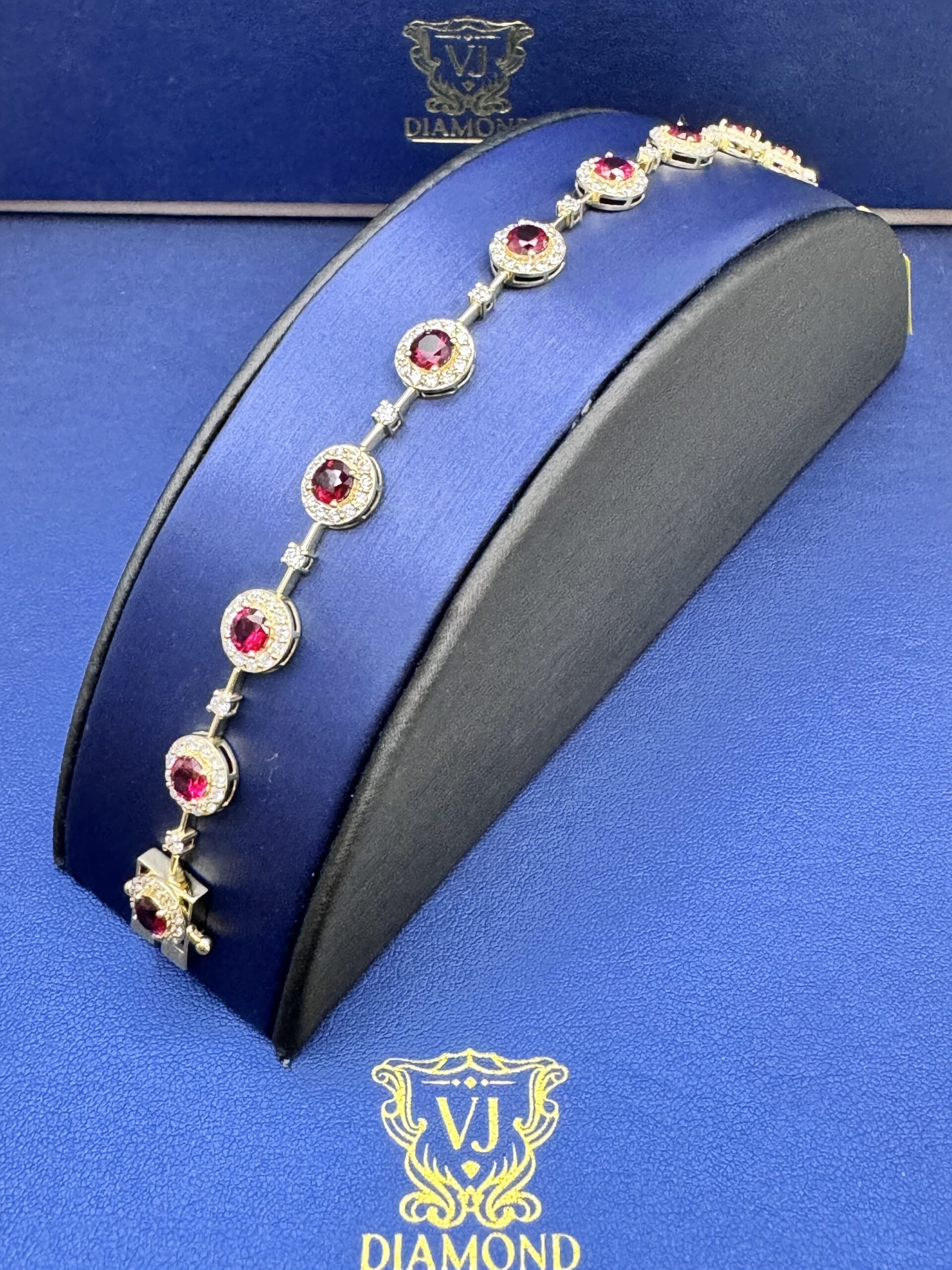 14KT Gold 8.35CT LabGrown Diamond Ruby Bracelet Perfect For MothersDay Or Any Occasion 2.54CT White Diamonds 5.81 CT Color Stone VS Clarity Halo Round Shape Ruby n Diamonds Size 7 Approx Gold Weight 9.4 Gram 9MM Width