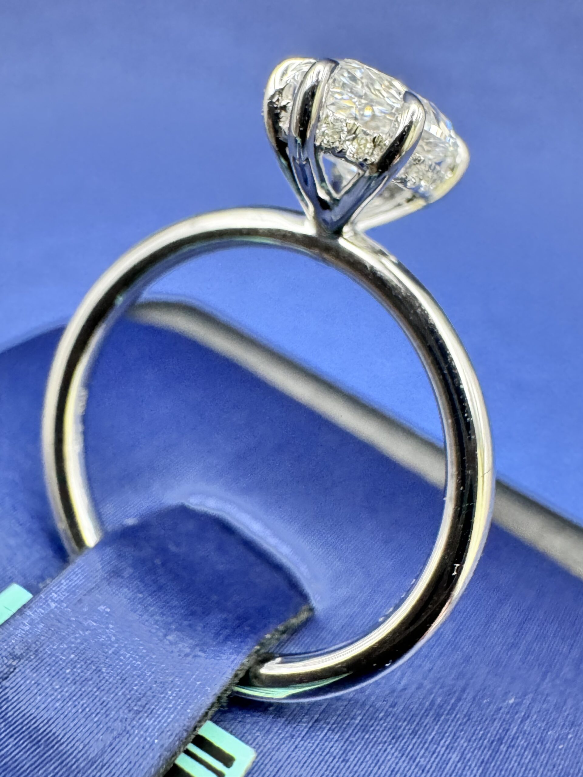 14KT W/Gold 2.12CT LabGrown Marquee Diamond Ring Center Solitaire 2.02CT Size 7 Smooth Classic Mounting 4 Prongs Hidden Halo Set Approx Gold Weight 3.4 Gram VS1 Clarity E Color Sizing Available Comes With Certification 2MM Band Width