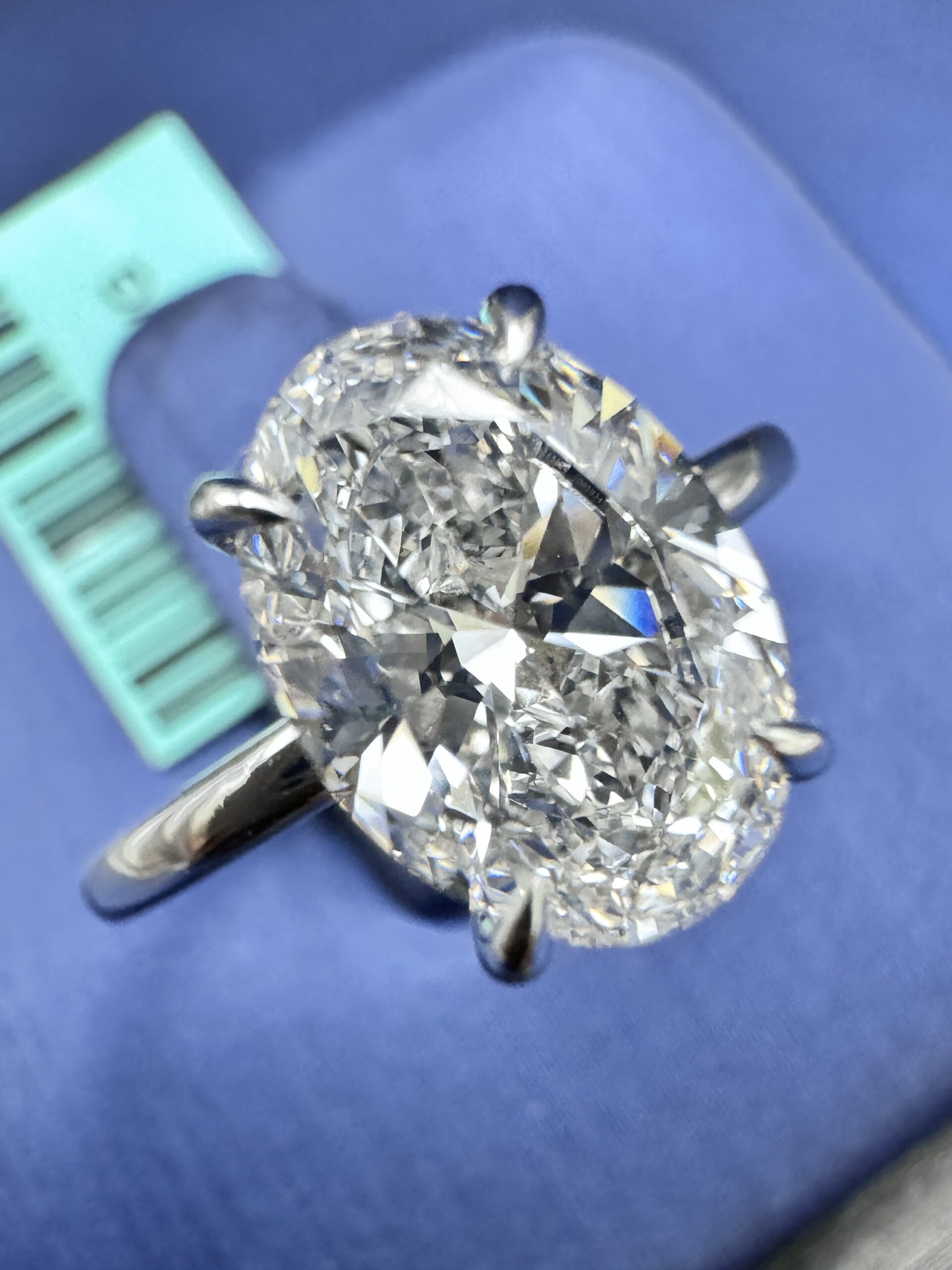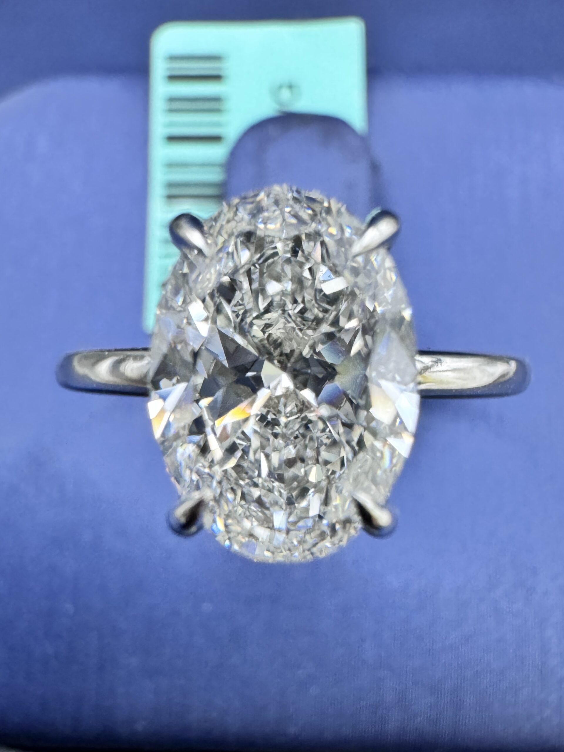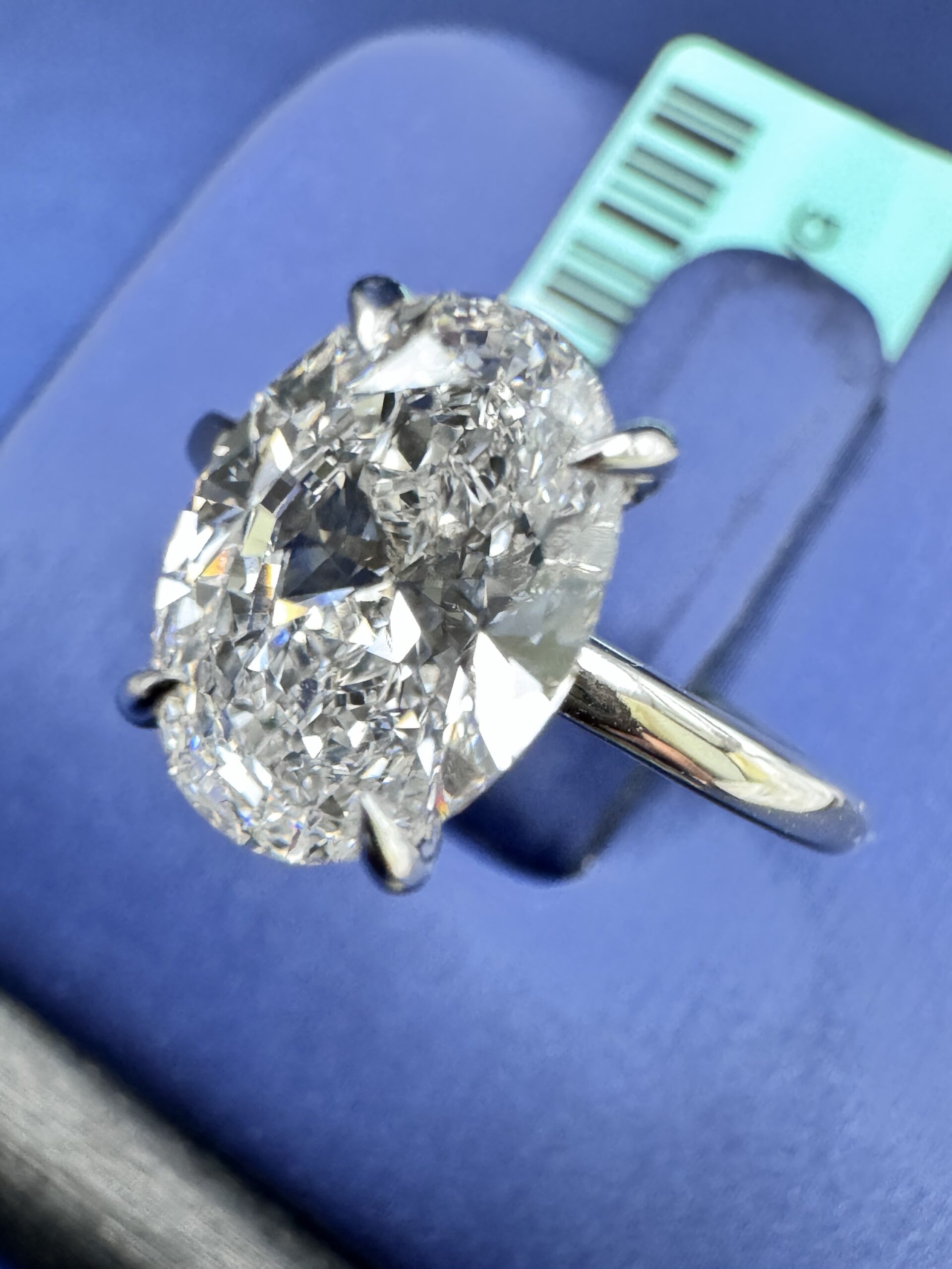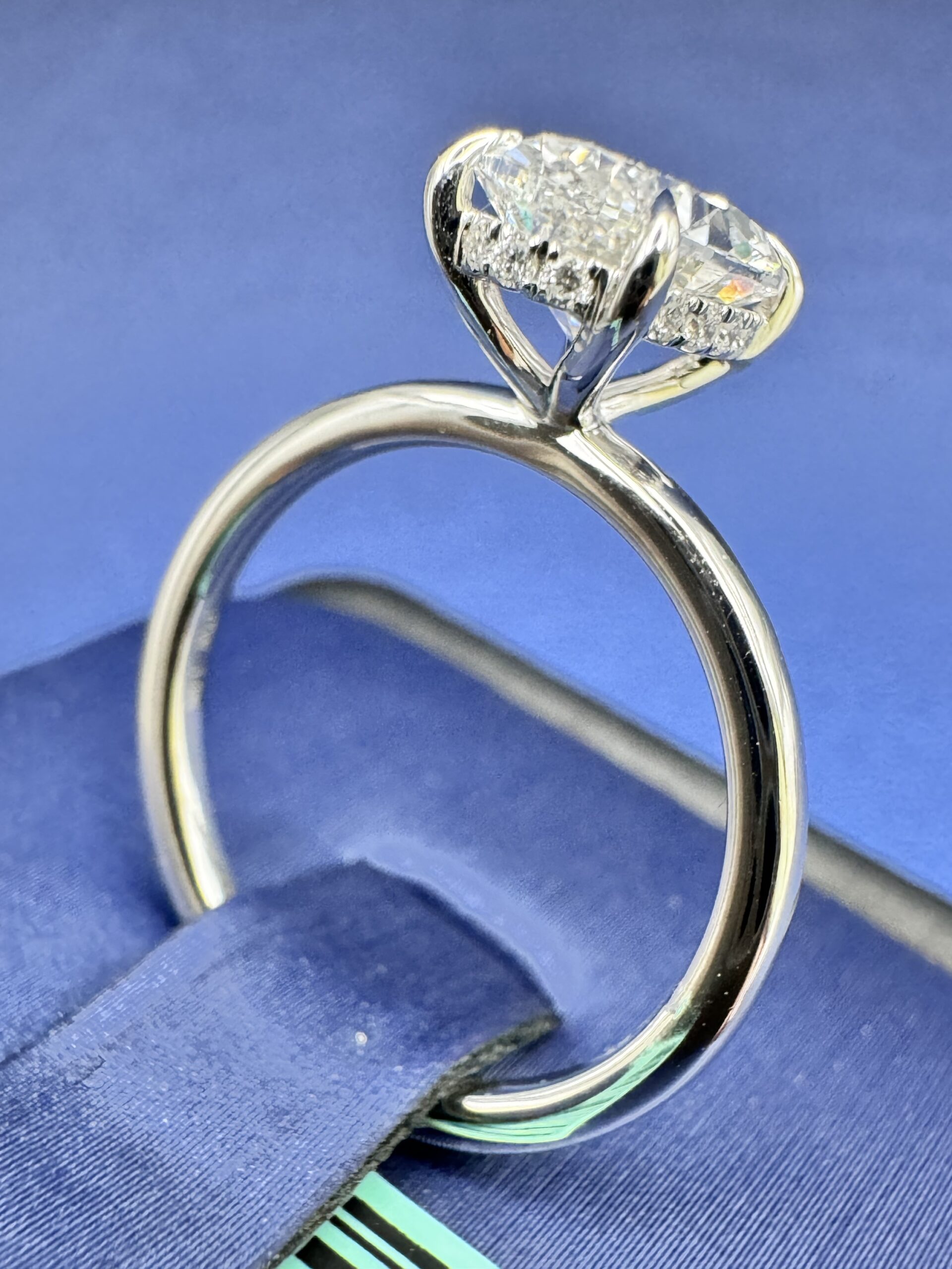 14KT W/Gold 2.18CT LabGrown Oval Diamond Ring Center Solitaire 2.09 CT Size 7 Smooth Classic Plain Gold Mounting 4 Prongs Hidden Halo Set Approx Gold Weight 3.3 Gram VS1 Clarity E Color Sizing Available Comes With Certification 2MM Band Width